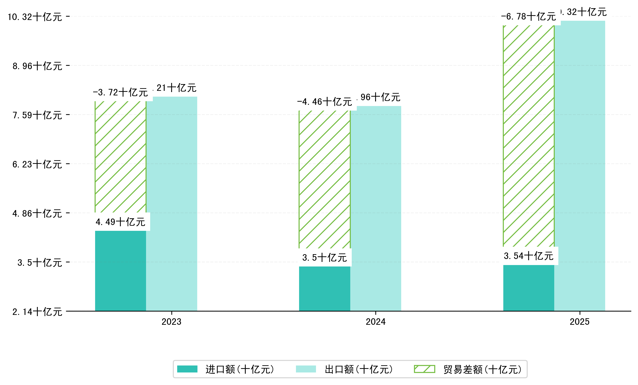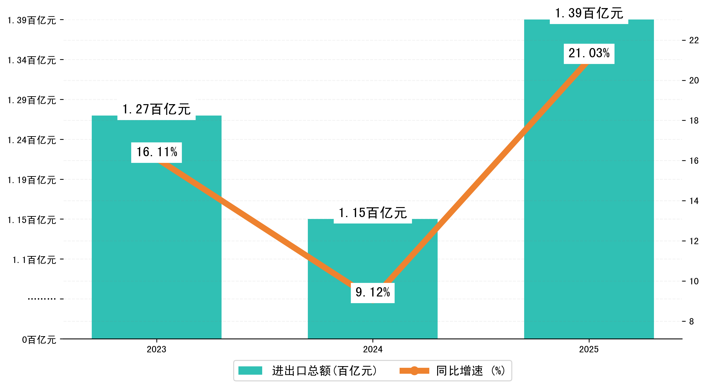 以人民币计,2025年4月荆州市贸易差额为14,1269,9228万元(贸易顺差),相比上月减少了5,3601,3029万元,即7446,4554万美元;相比上年同期增加了3,8708,5810万元,同比增加37.74%。