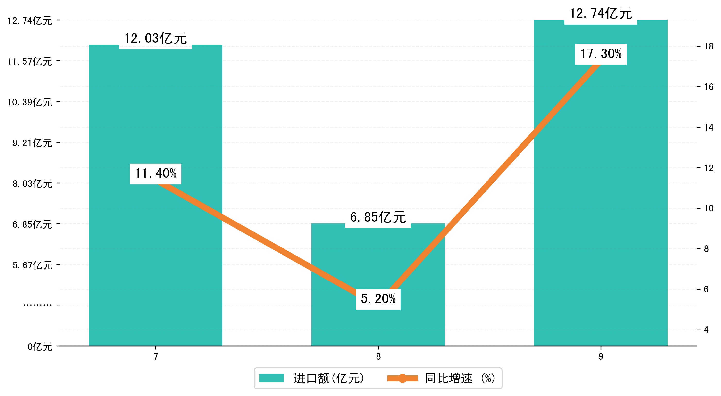 以人民币计,2025年9月荆州市进口额为12,7448.2159万元,相比上月增加了5,8919.0242万元;相比上年同期增加了8,1841.0635万元,同比增加了17.30%。