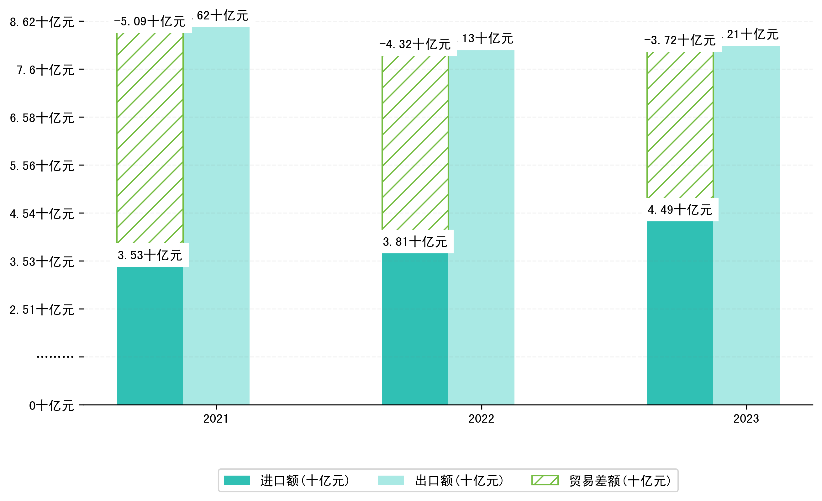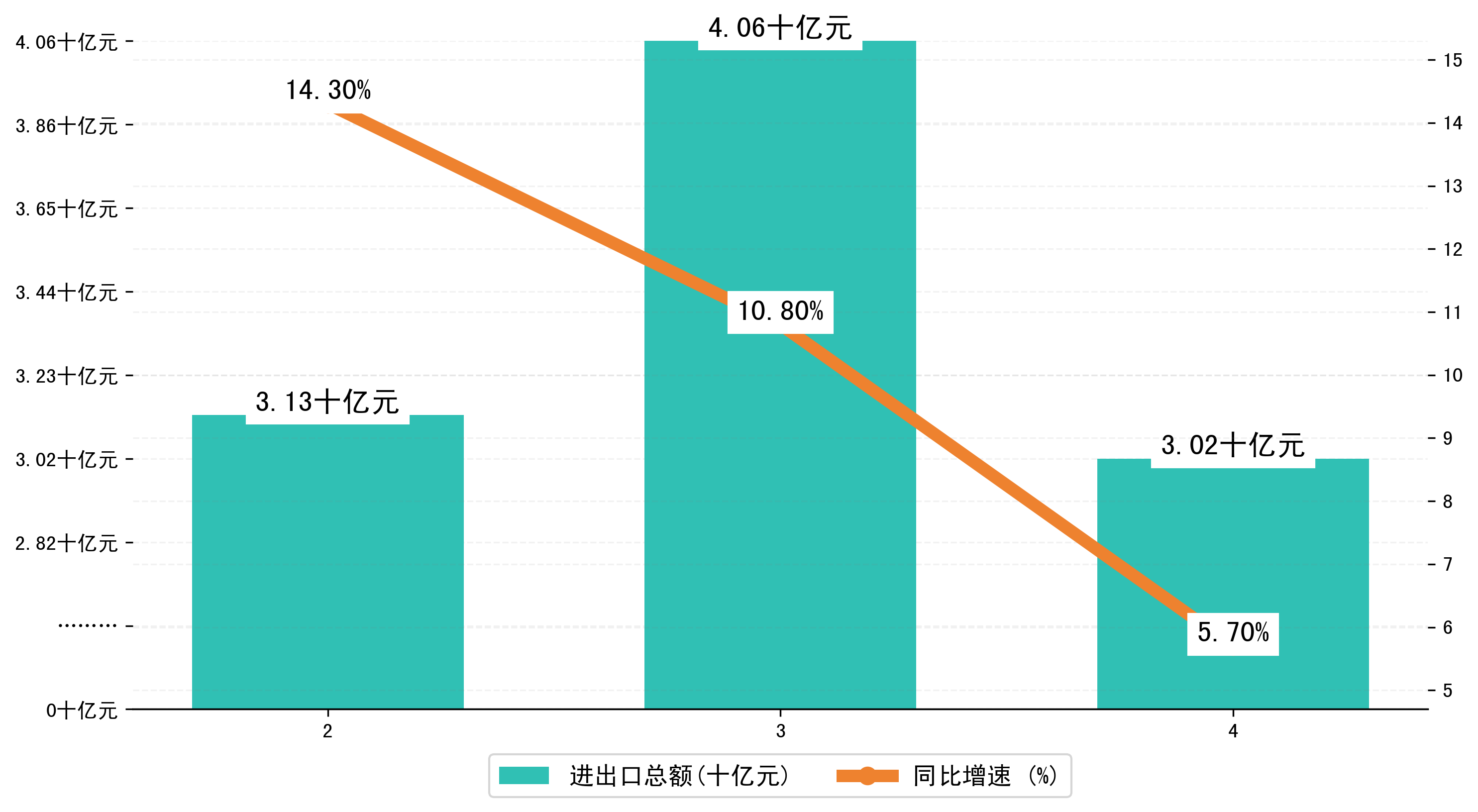 以人民币计,2023年4月荆州市贸易差额为15,5993,6870万元(贸易顺差),相比上月增加了17,0090,4815万元,即2,4806,2638万美元;相比上年同期增加了2,5063,9754万元,同比增加19.14%。