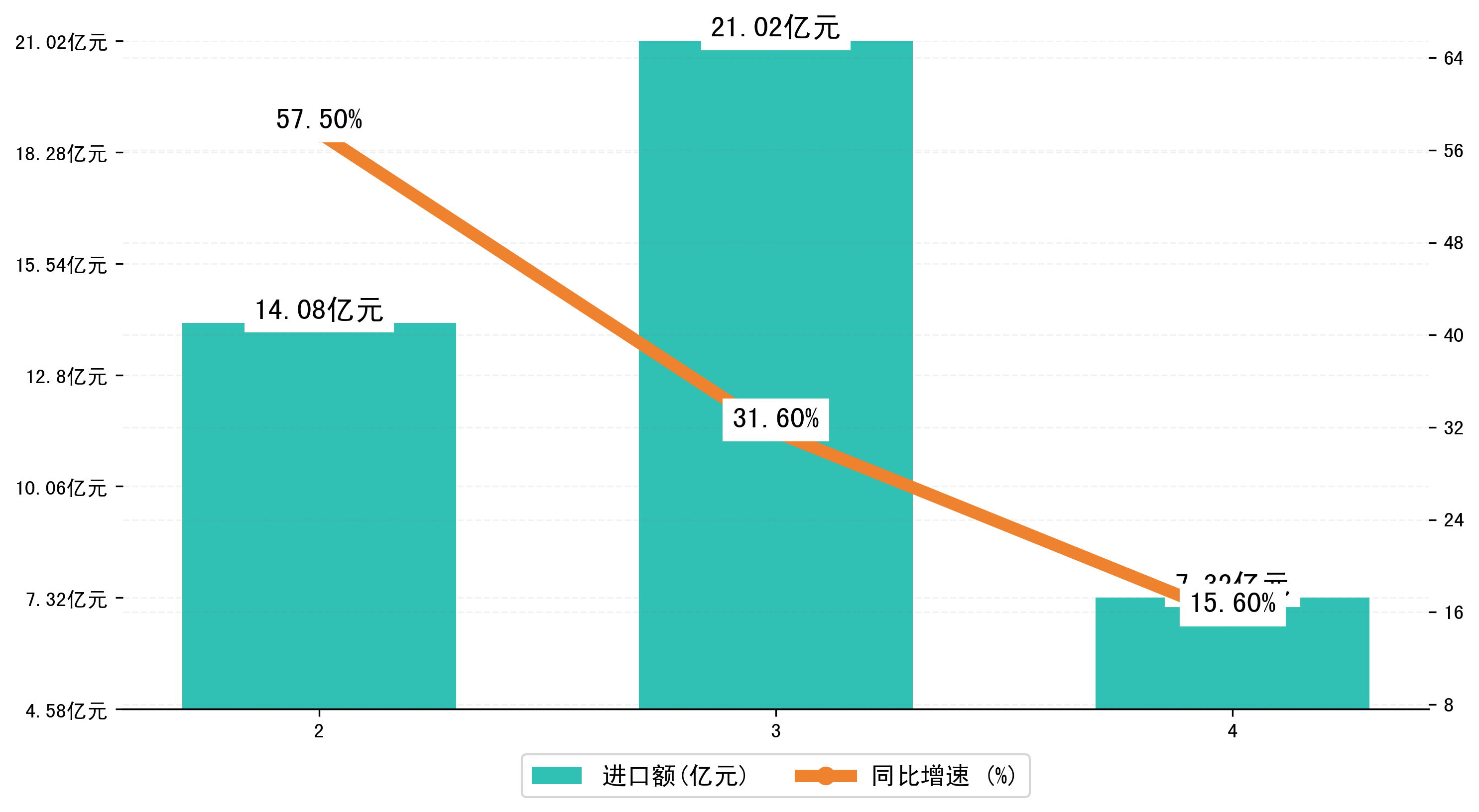 以人民币计,2023年1-4月荆州市进口额为44,9059.6855万元,相比上年同期增加了6,7841.9976万元,同比增加了15.60%。