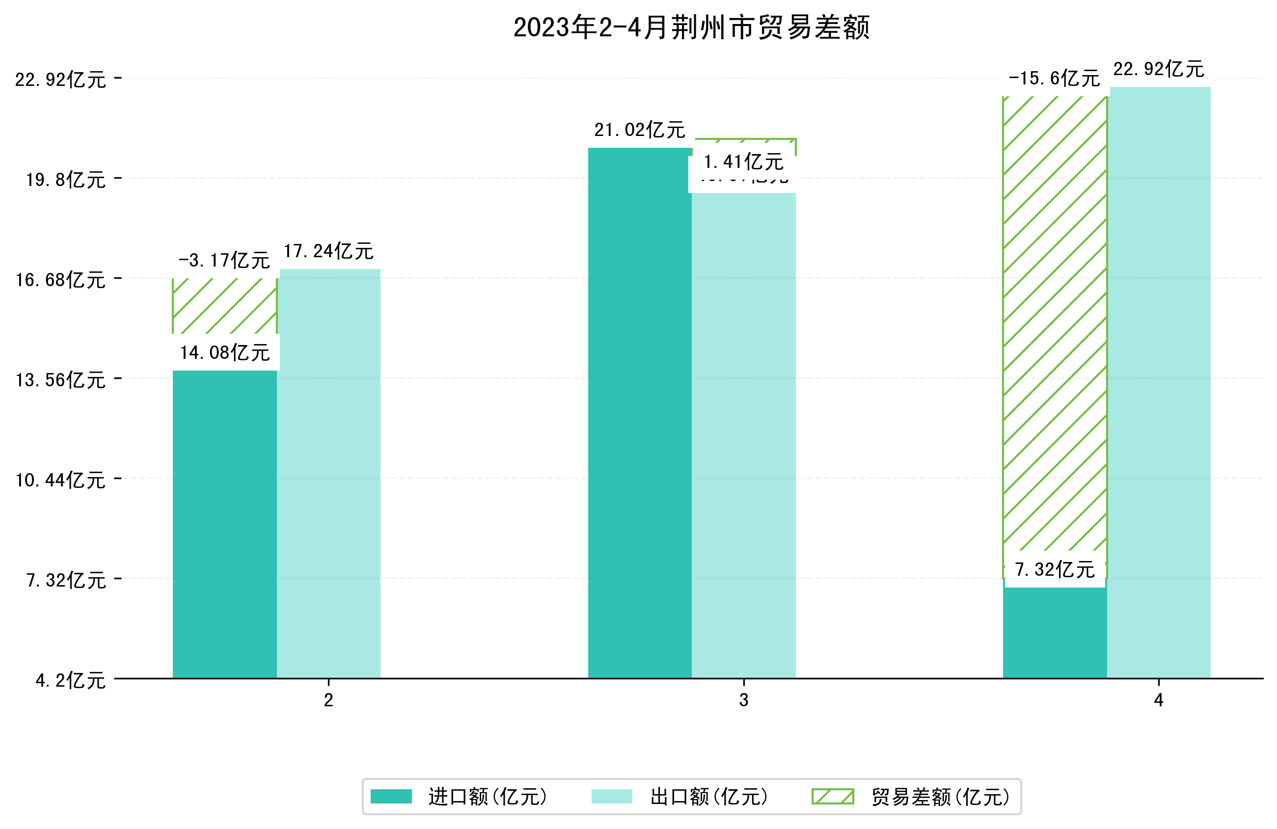以人民币计,2023年1-4月荆州市贸易差额为37,2419,7577万元(贸易顺差),相比上年同期减少了5,9166,3597万元,同比减少-13.71%。