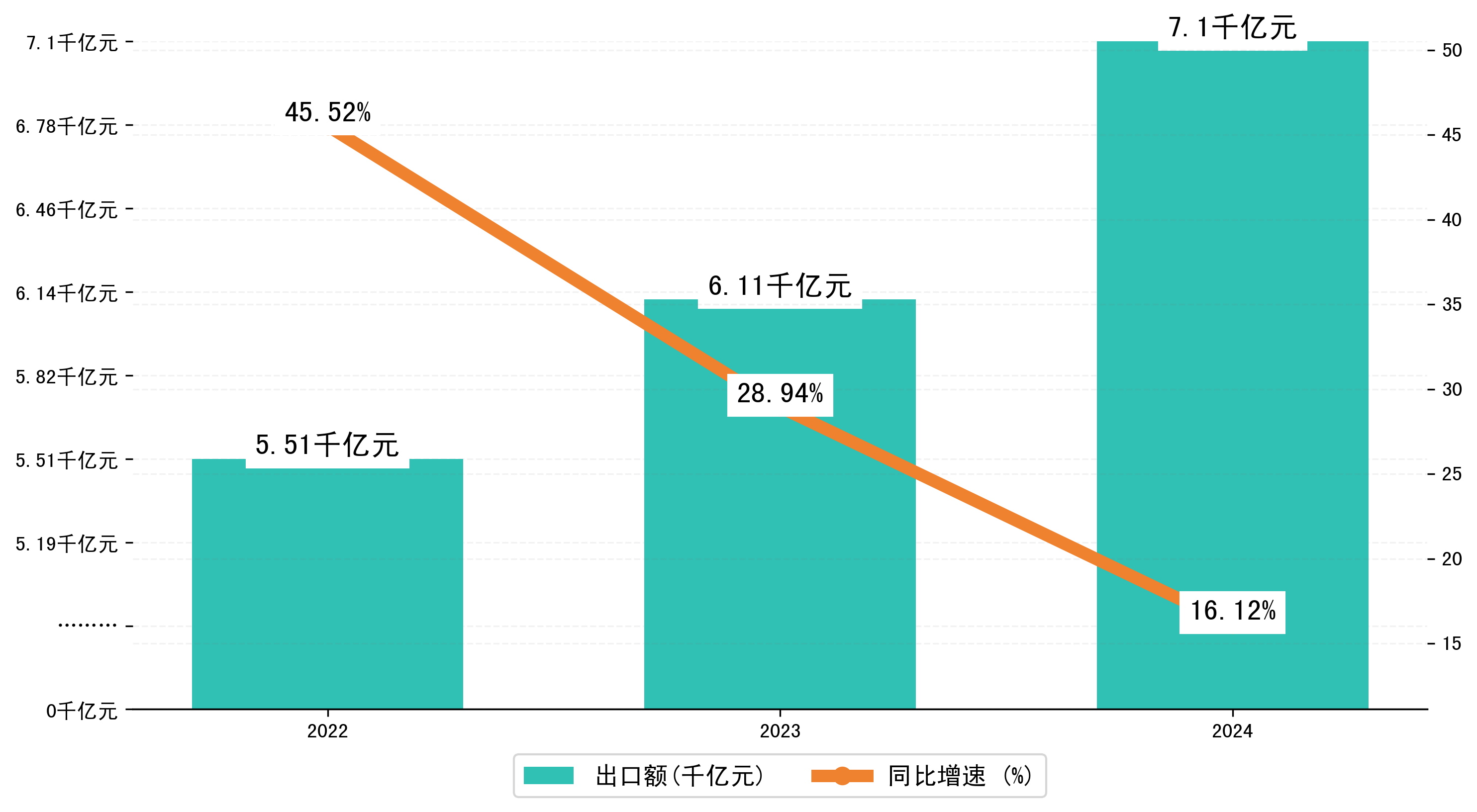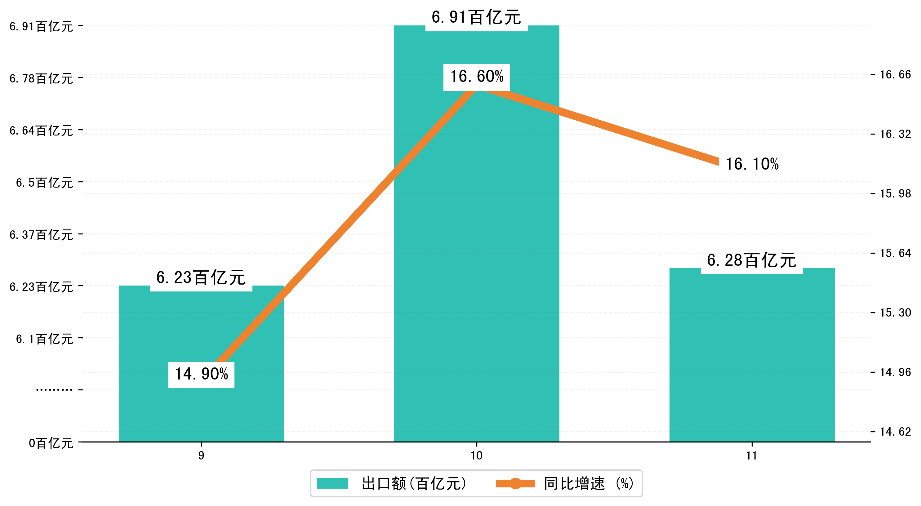以人民币计,2024年1-11月金华市出口额为7098,8286.5794万元,相比上年同期增加了985,6301.1721万元,同比增加了16.10%。
