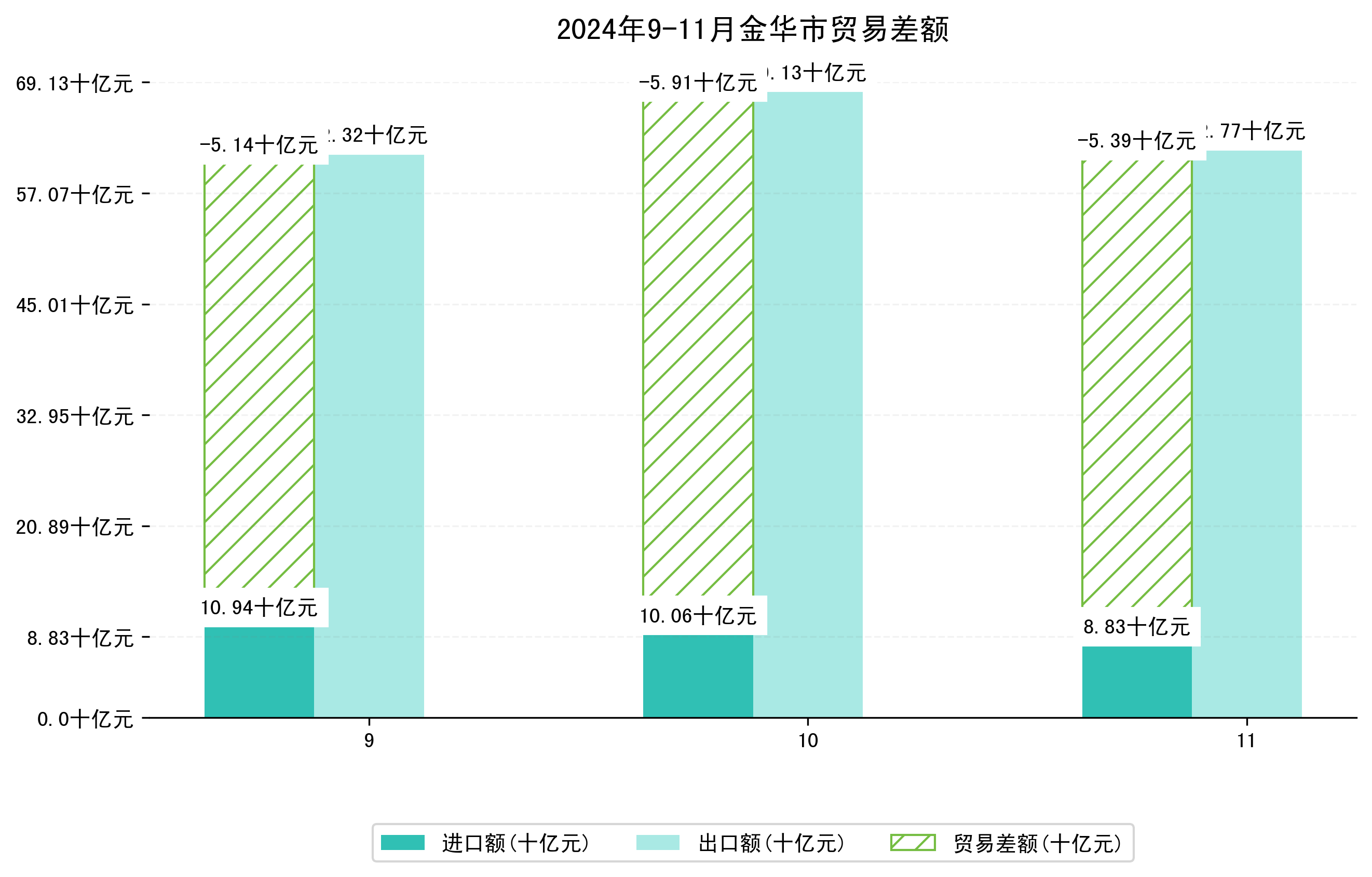 以人民币计,2024年1-11月金华市贸易差额为6134,3011,4128万元(贸易顺差),相比上年同期增加了1010,0427,1270万元,同比增加19.71%。