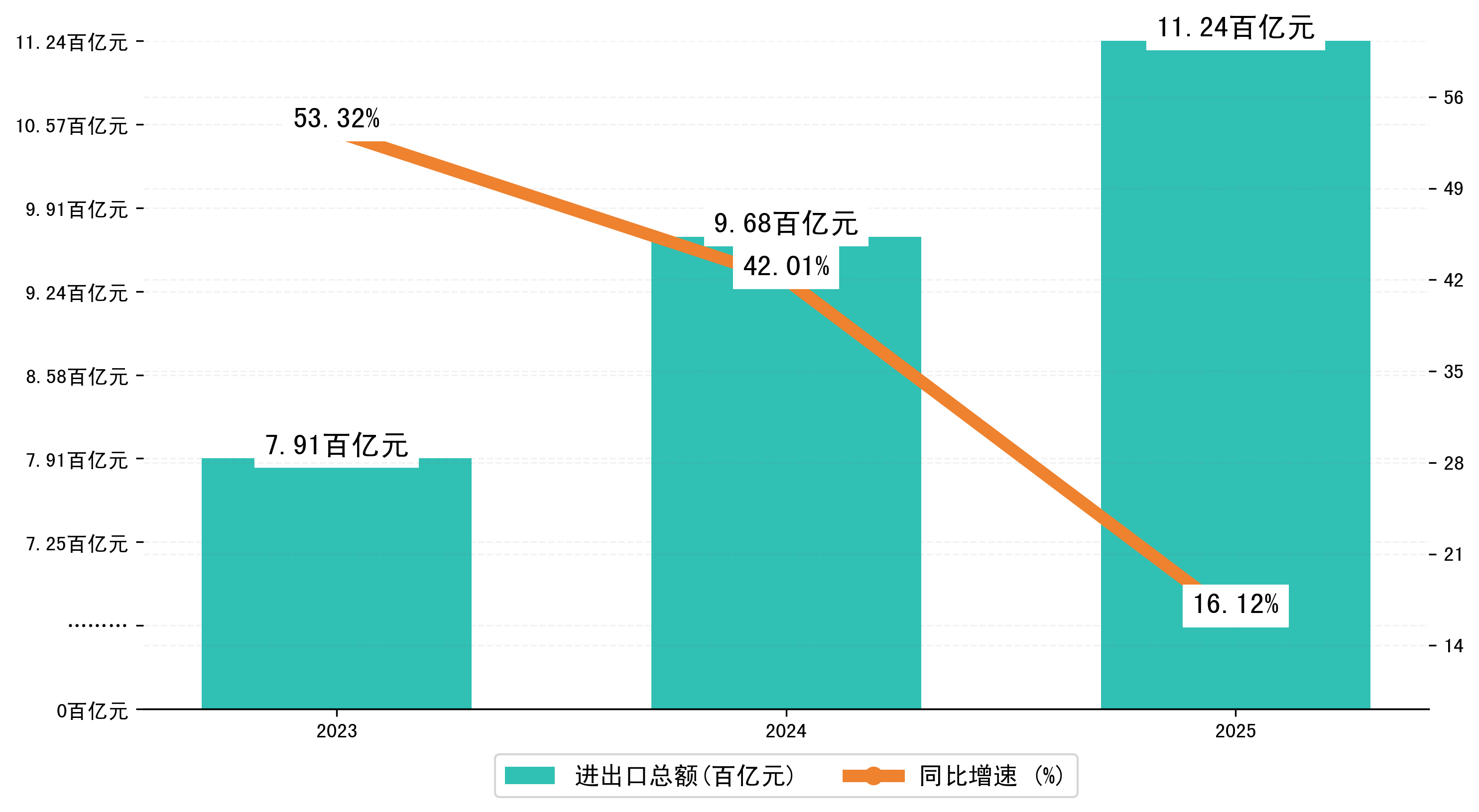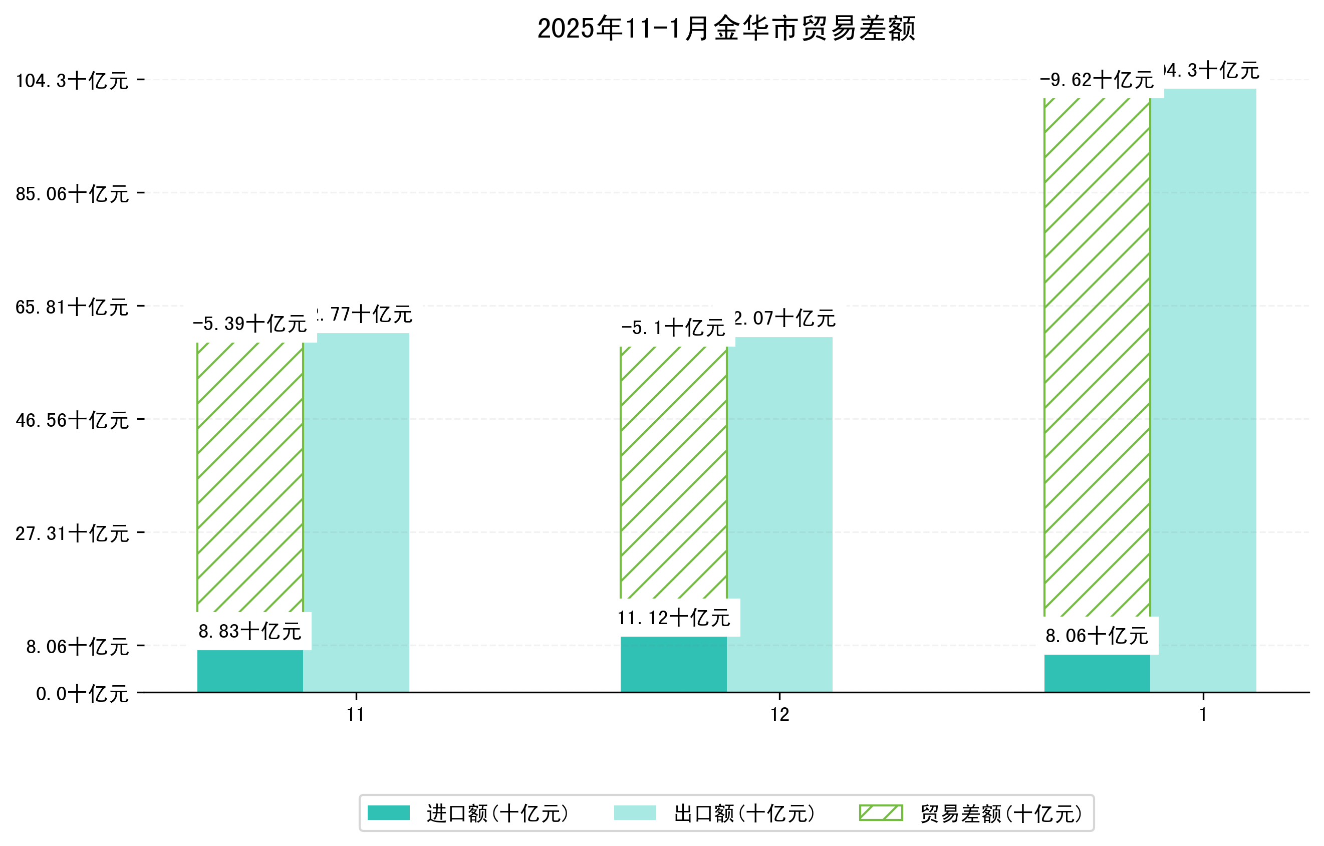 以美元计,2025年1-1月金华市贸易差额为133,8723,7199万美元(贸易顺差),相比上年同期增加了29,1997,6936万美元,同比增加27.9%。