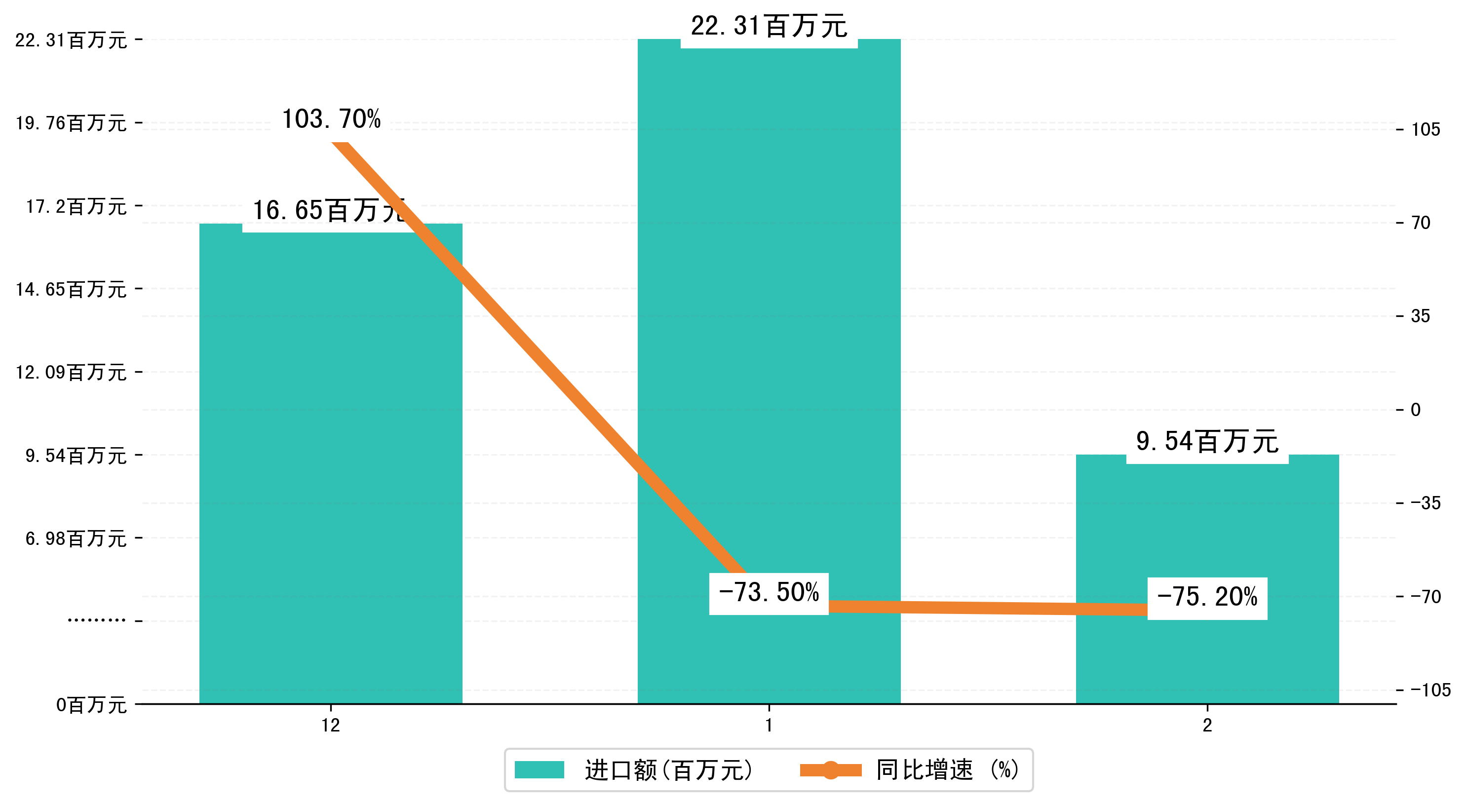 以美元计,2023年2月晋中市进口额为141.0735万美元,相比上月减少了179.3259万美元;相比上年同期减少了550.7077万美元,同比减少-77.10%。