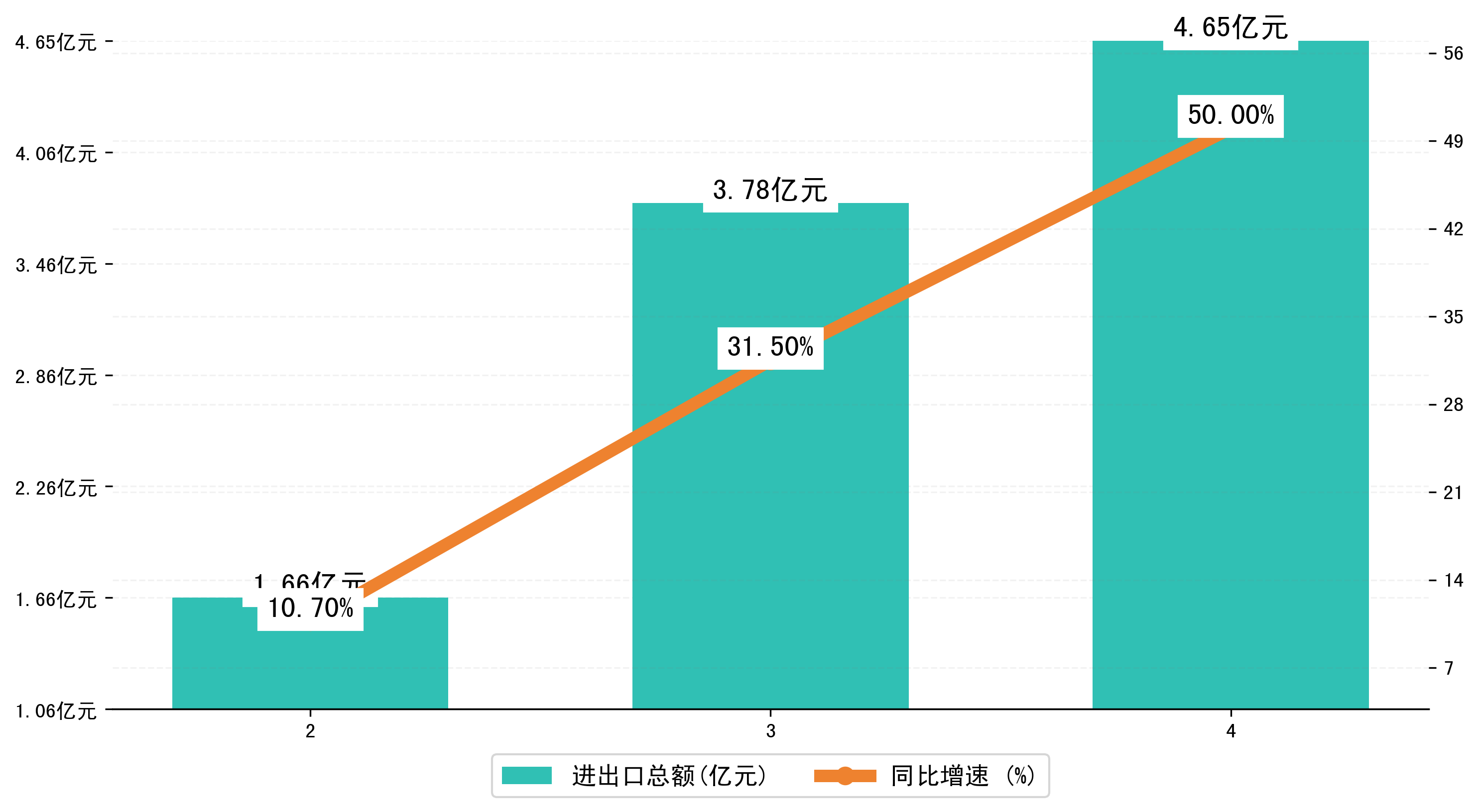 以人民币计,2024年4月晋中市进出口总额为4,6548.1294万元,相比上月增加了8726.1384万元;相比上年同期增加了2,3256.3669万元,同比增加了50.00%。