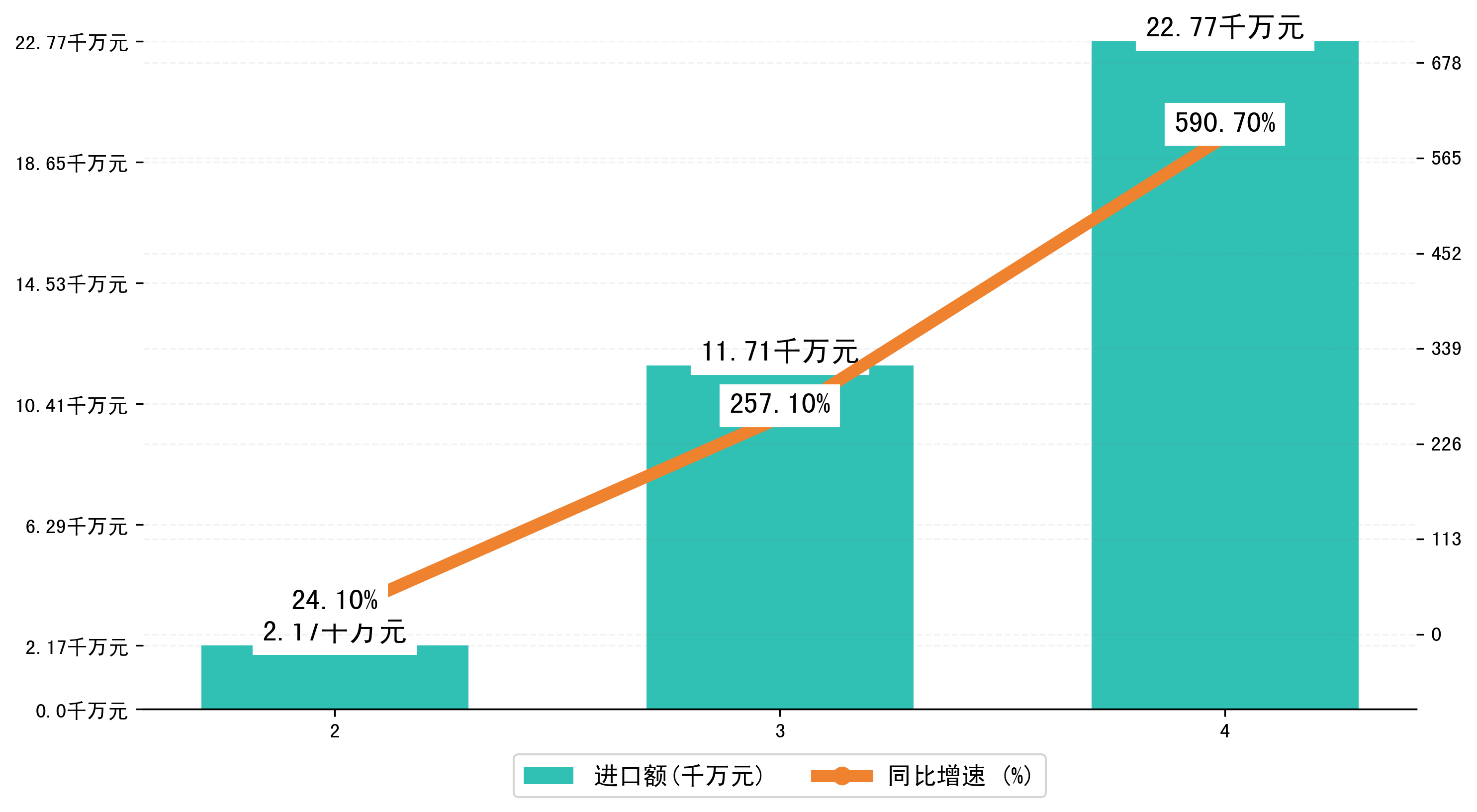 以人民币计,2024年1-4月晋中市进口额为3,8433.0076万元,相比上年同期增加了3,2868.4864万元,同比增加了590.70%。