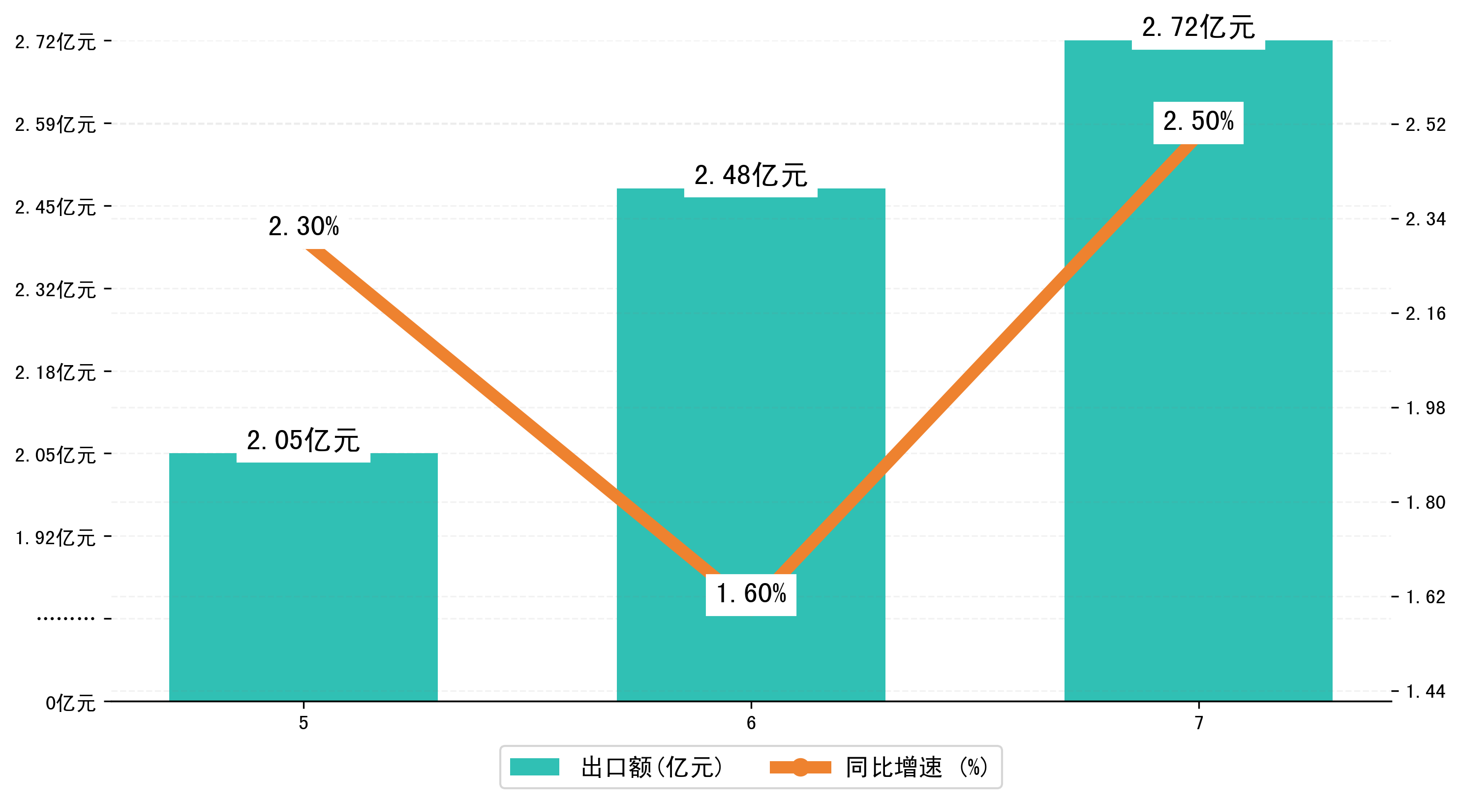 以人民币计,2024年7月晋中市出口额为2,7188.5754万元,相比上月增加了2394.8086万元;相比上年同期增加了1829.2033万元,同比增加了2.50%。