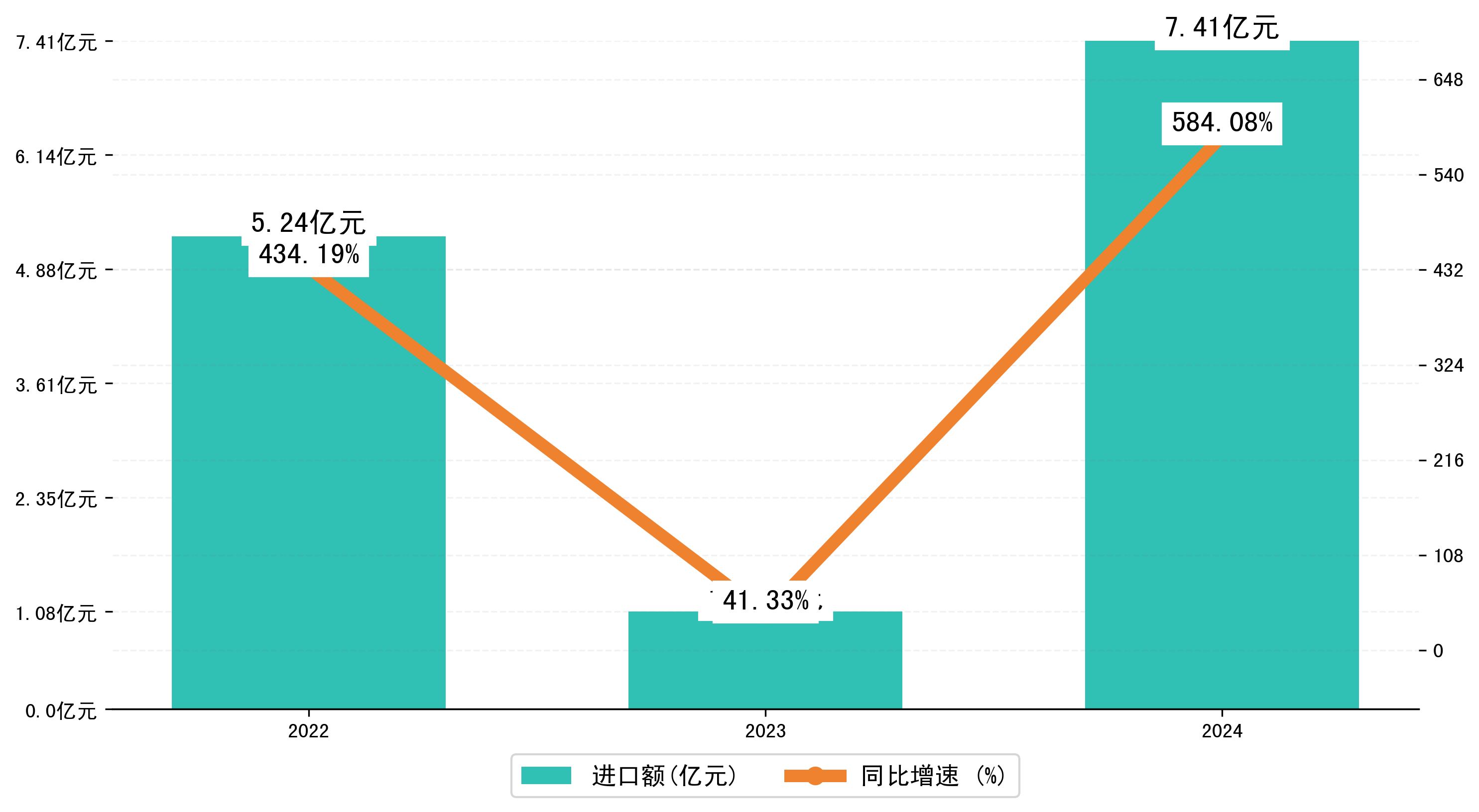 以美元计,2024年1-7月晋中市进口额为1,0424.2569万美元,相比上年同期增加了8867.0833万美元,同比增加569.40%。