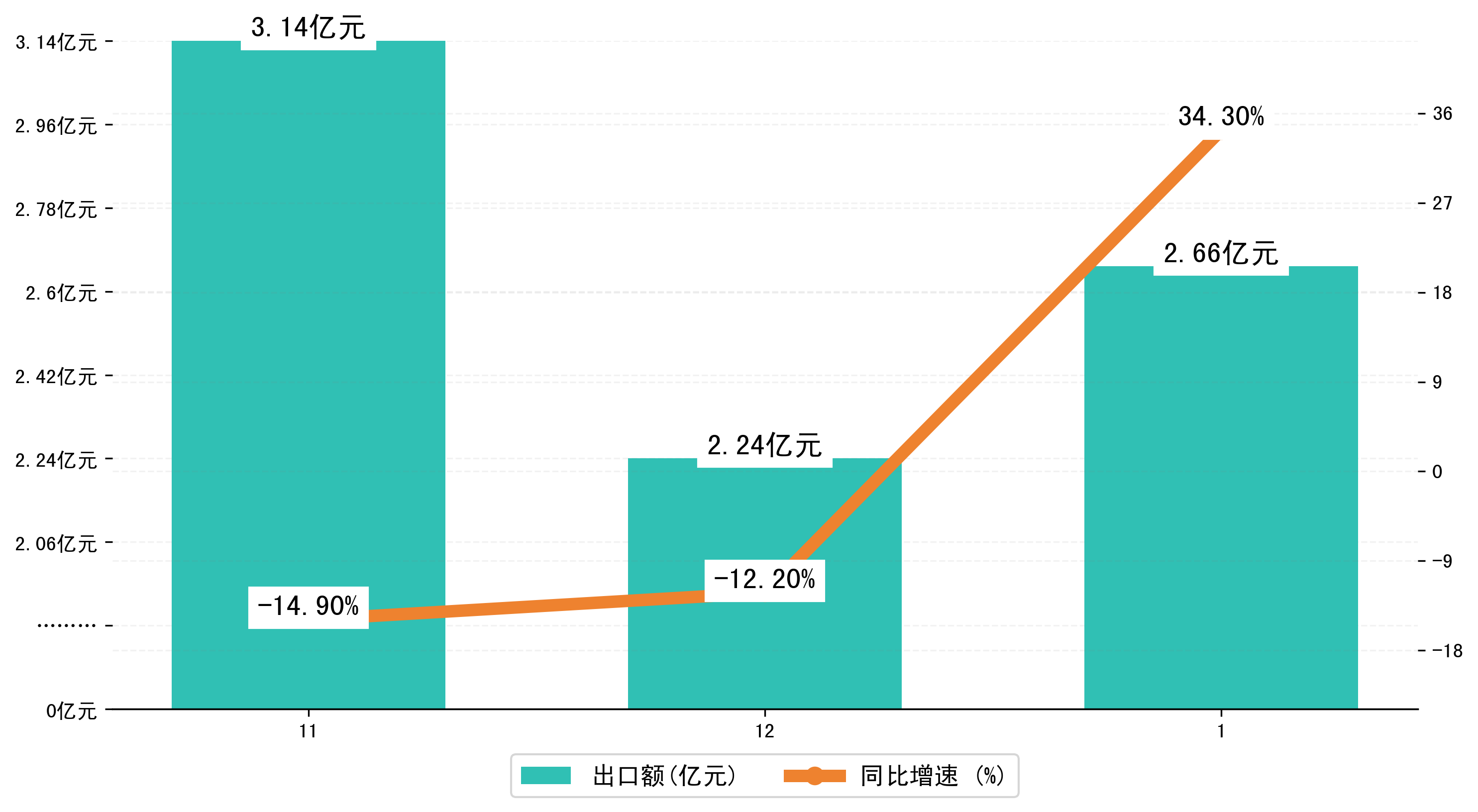 以人民币计,2024年1月晋中市出口额为2,6570.5129万元,相比上月增加了4130.1372万元;相比上年同期增加了6782.4867万元,同比增加了34.30%。