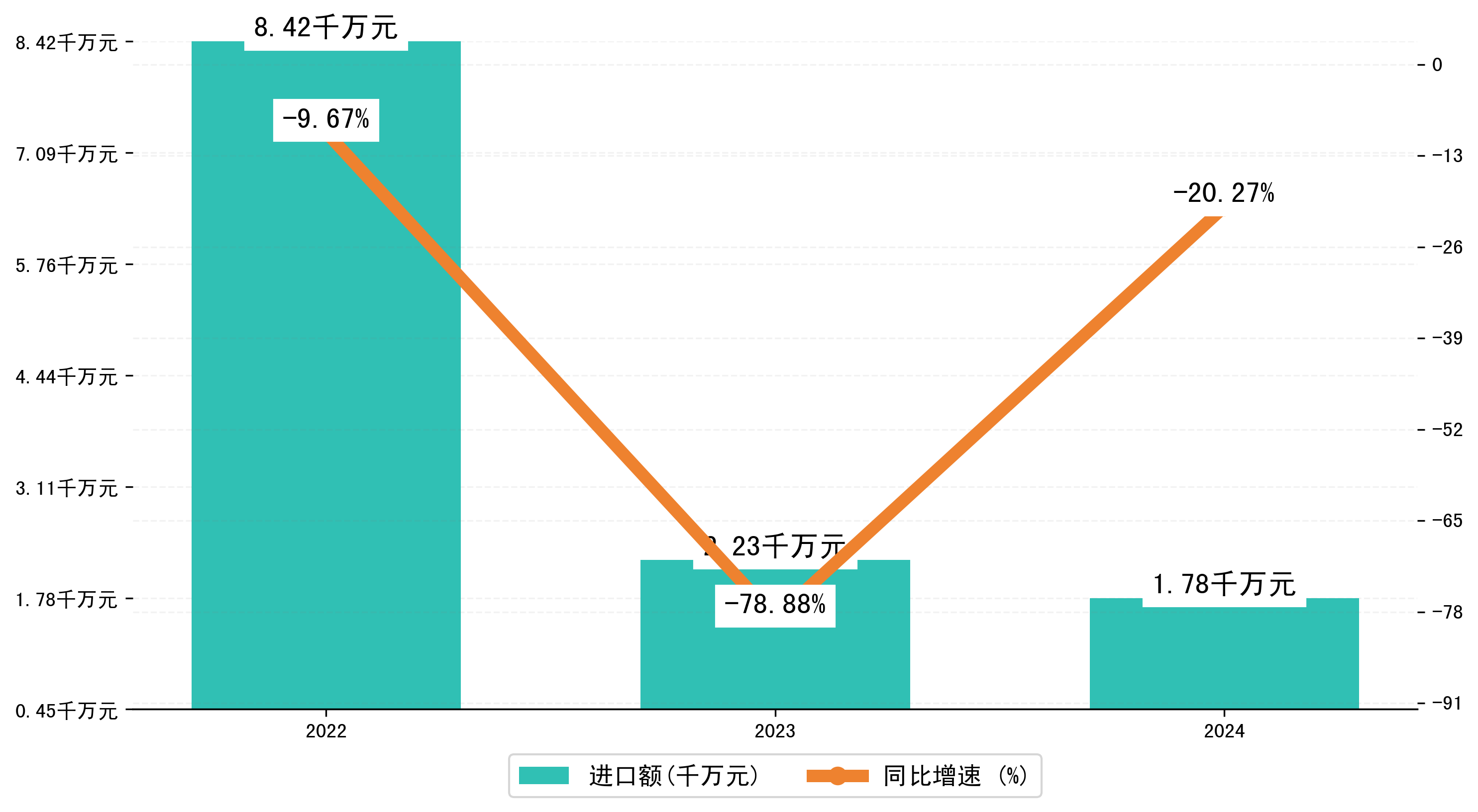 以人民币计,2024年1-1月晋中市进口额为1778.8401万元,相比上年同期减少了452.2056万元,同比减少了-20.30%。