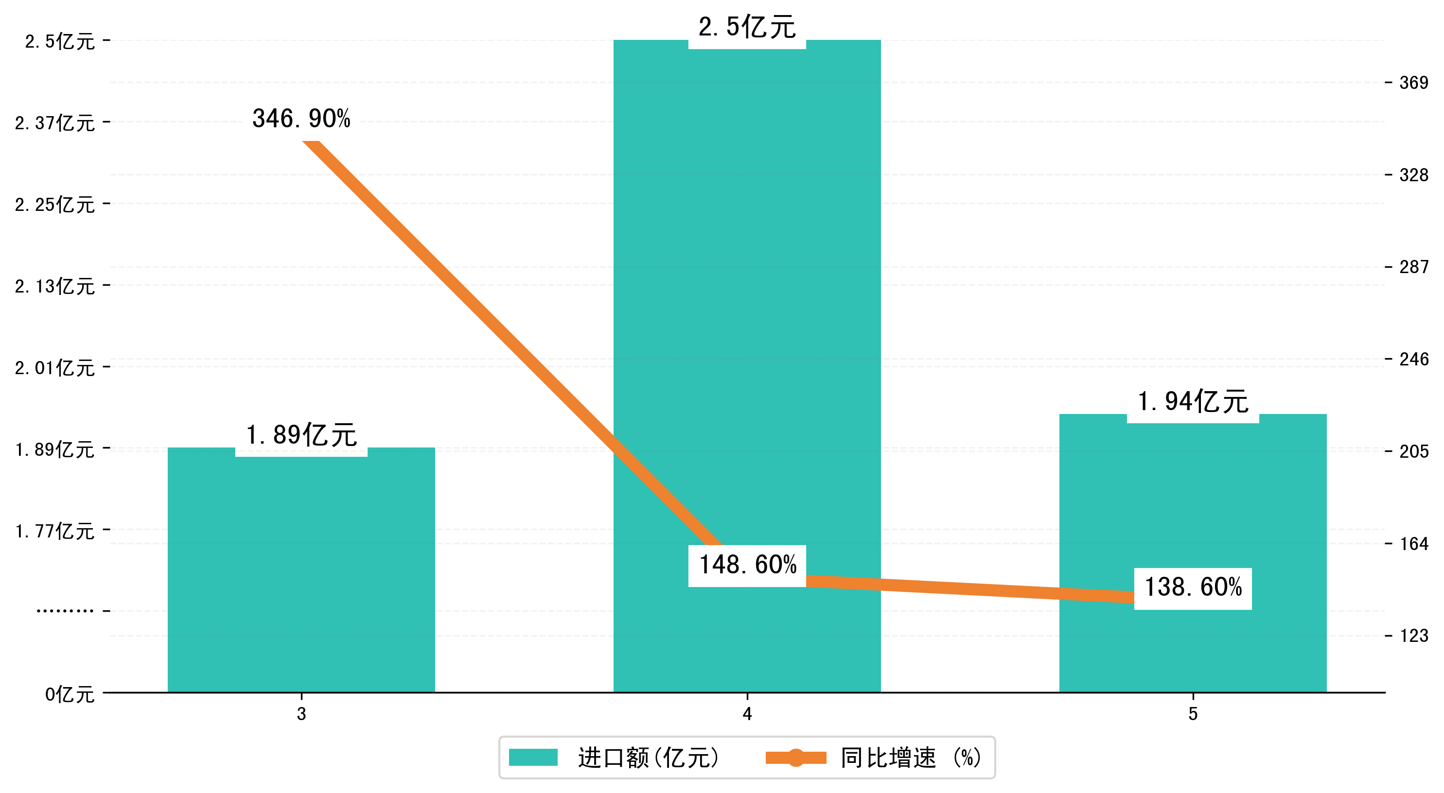 以人民币计,2025年5月晋中市进口额为1,9389.5157万元,相比上月减少了5564.603万元;相比上年同期增加了8663.347万元,同比增加了138.60%。