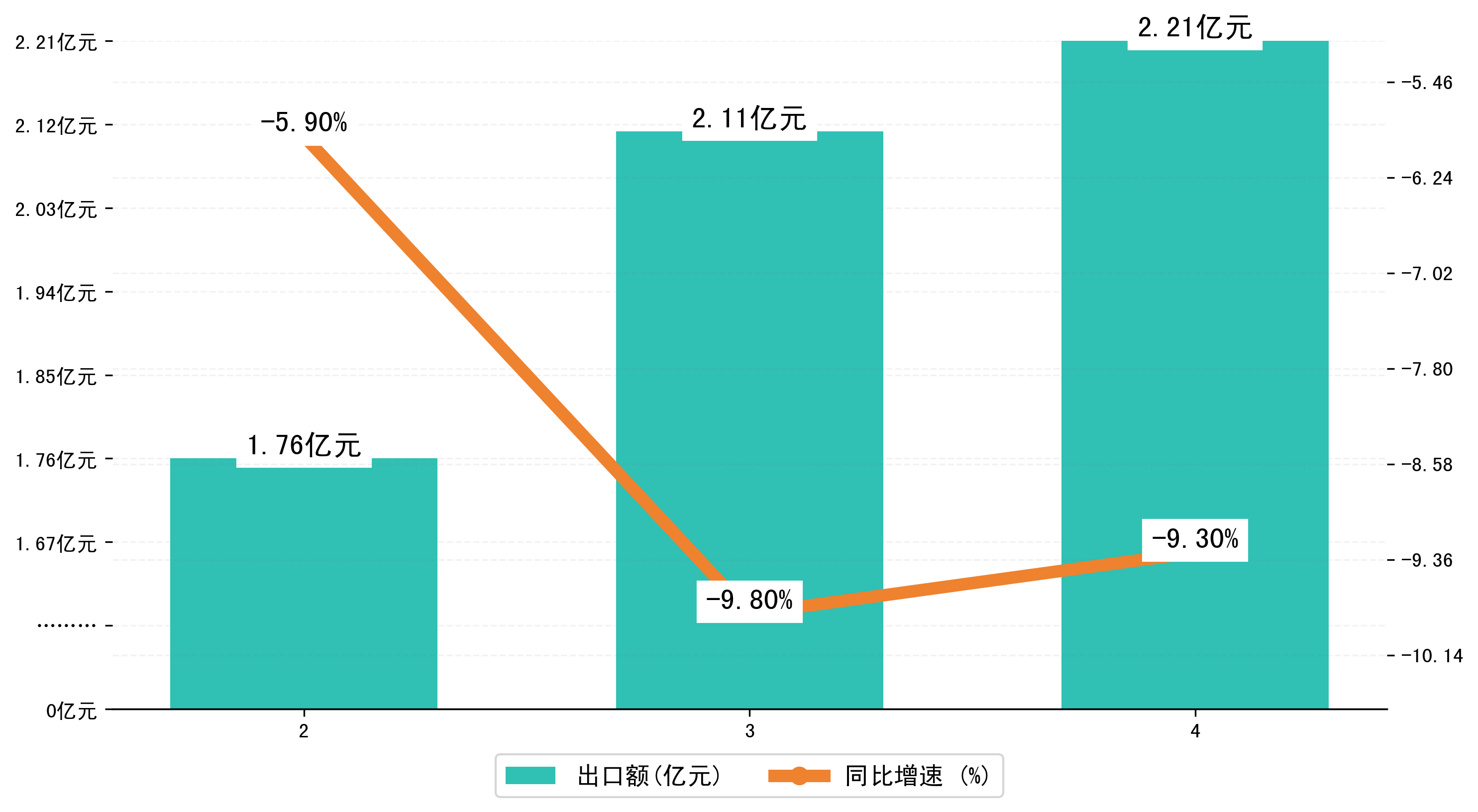 以美元计,2023年1-4月晋中市出口额为1,1760.7734万美元,相比上年同期减少了2209.1714万美元,同比减少-15.80%。
