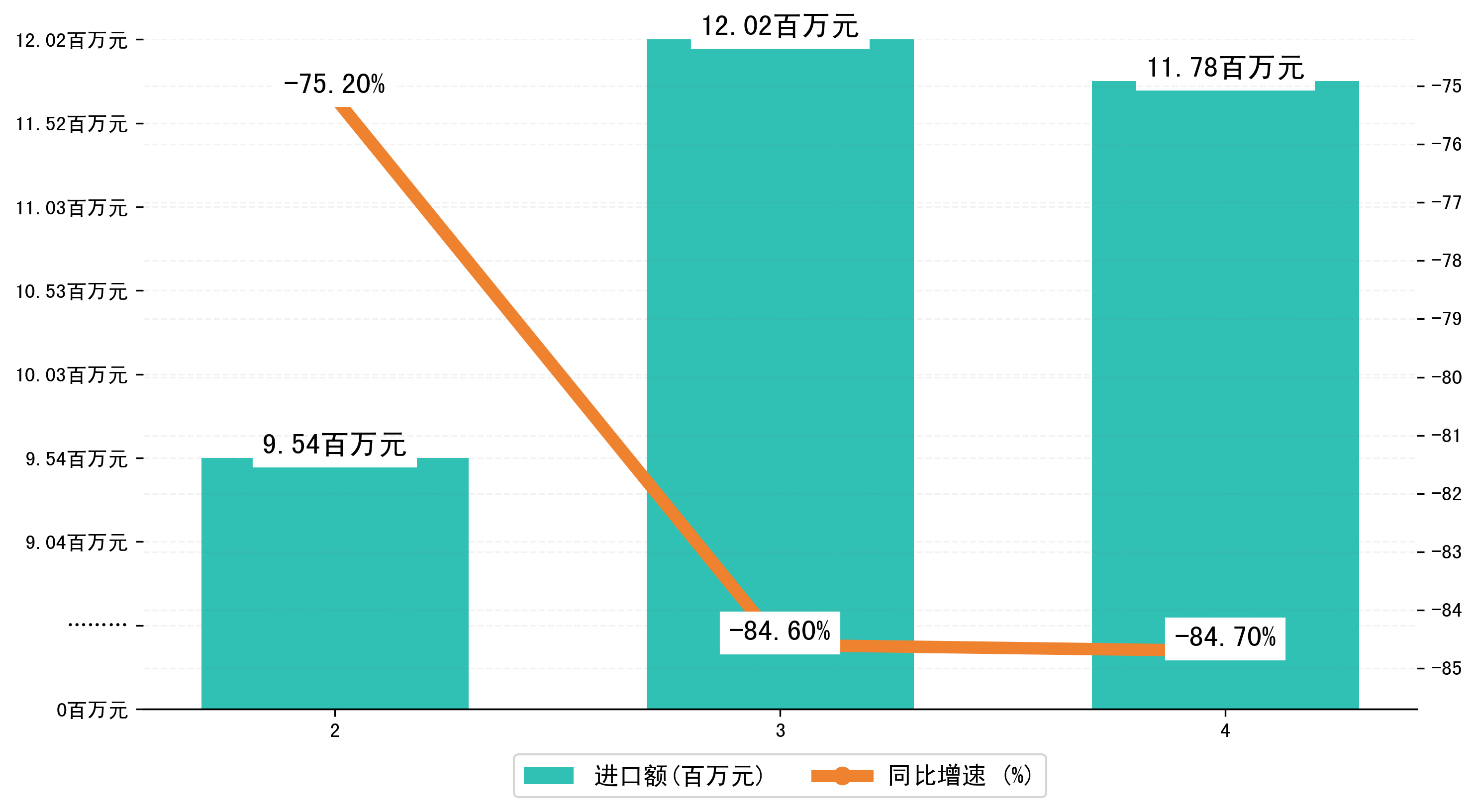 以美元计,2023年4月晋中市进口额为172.2323万美元,相比上月减少了3.5136万美元;相比上年同期减少了1061.9032万美元,同比减少-85.80%。