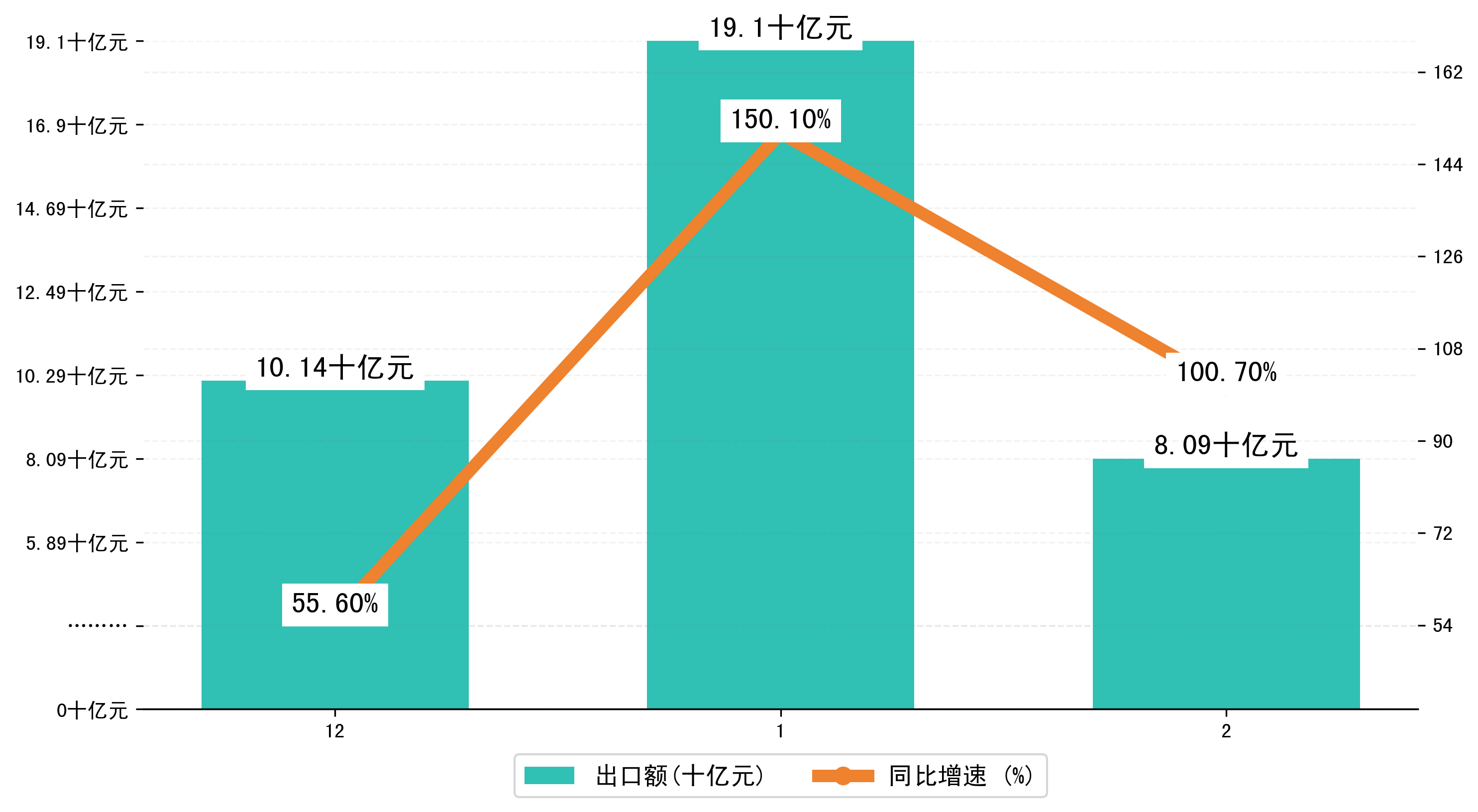 以美元计,2023年1-2月九江市出口额为39,2899.7331万美元,相比上年同期增加了17,5273.4843万美元,同比增加84.90%。