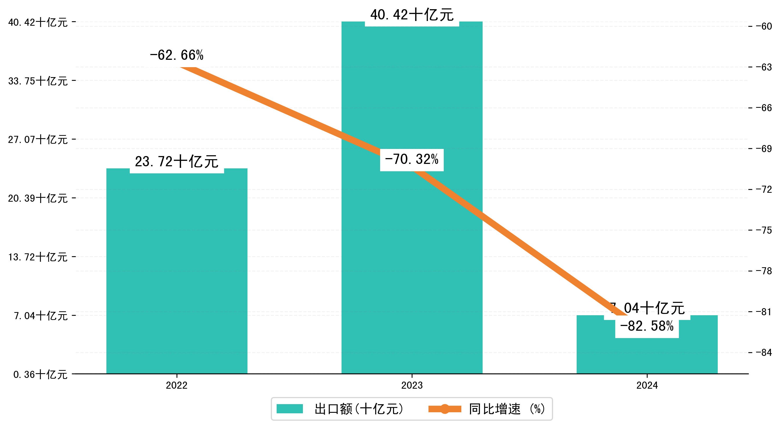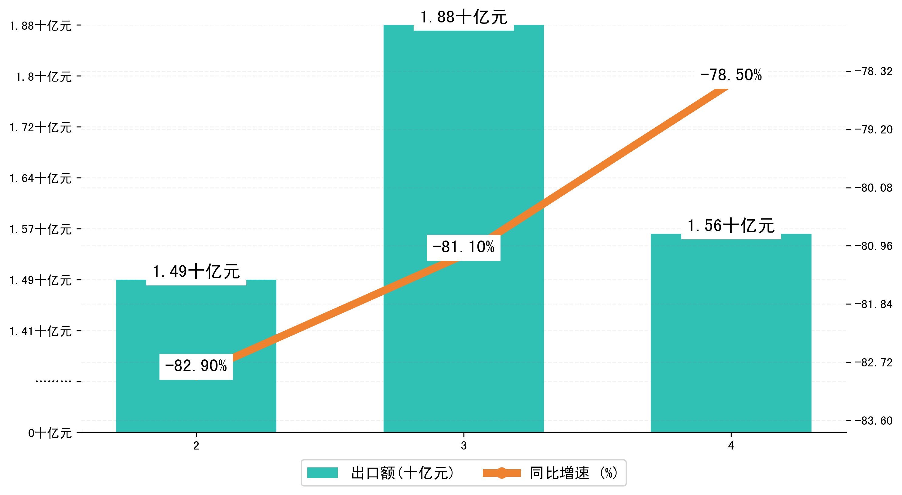 以人民币计,2024年1-4月九江市出口额为70,3991.975万元,相比上年同期减少了333,8278.834万元,同比减少了-78.50%。