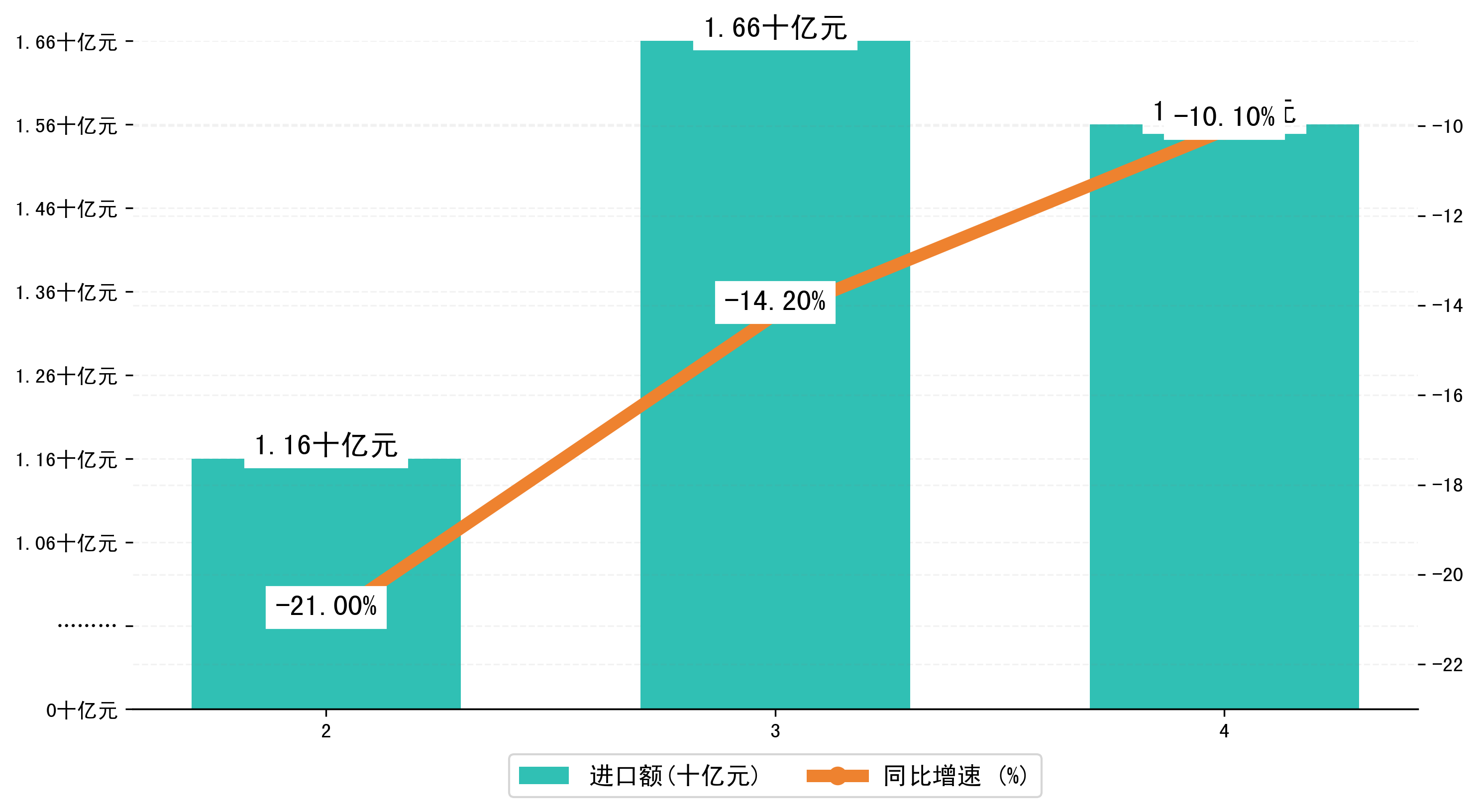 以人民币计,2024年1-4月九江市进口额为59,7792.8827万元,相比上年同期减少了6,6867.9372万元,同比减少了-10.10%。