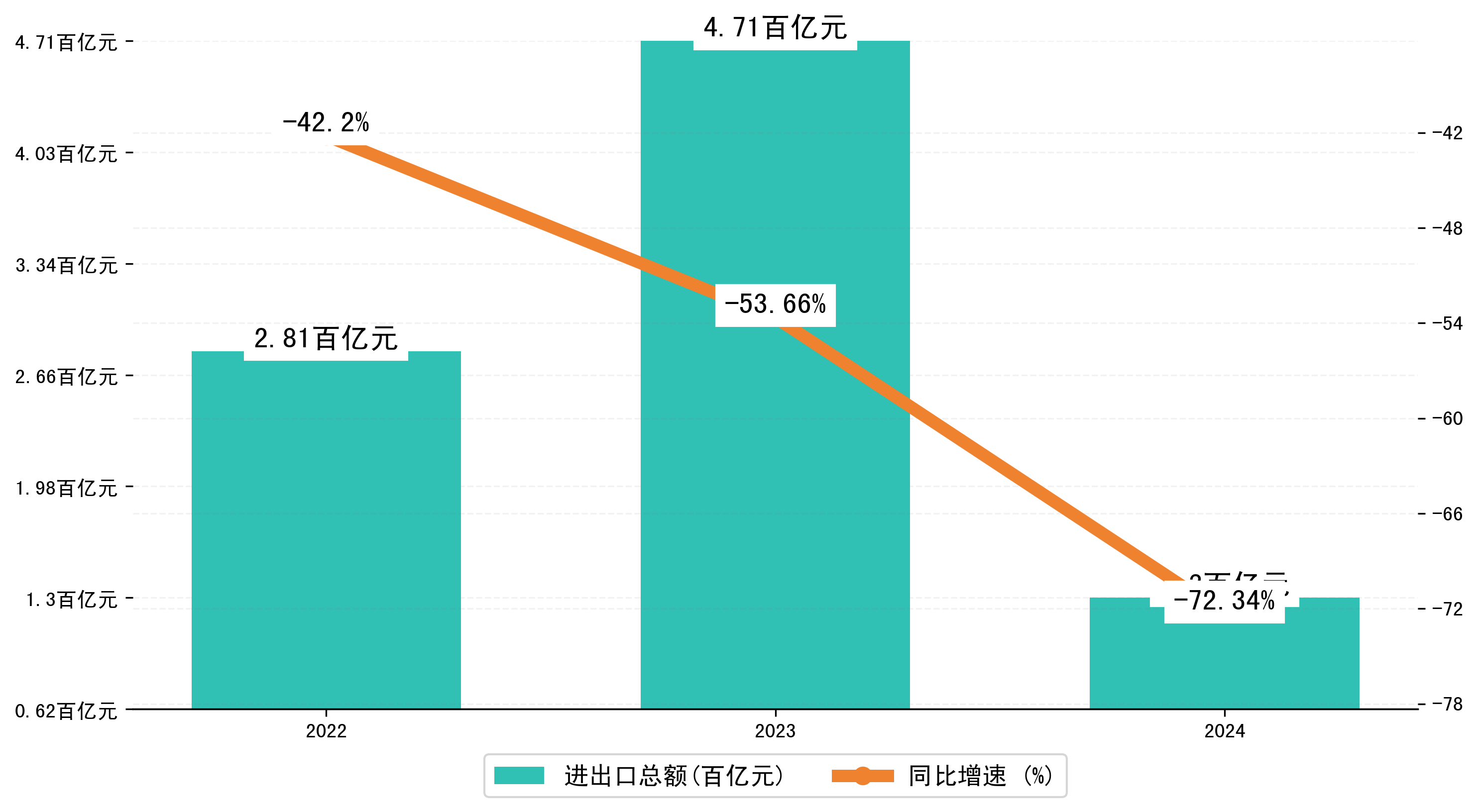 以美元计,2024年1-4月九江市进出口总额为18,3255.0767万美元,相比上年同期减少了49,9975.1459万美元,同比减少-68.00%。