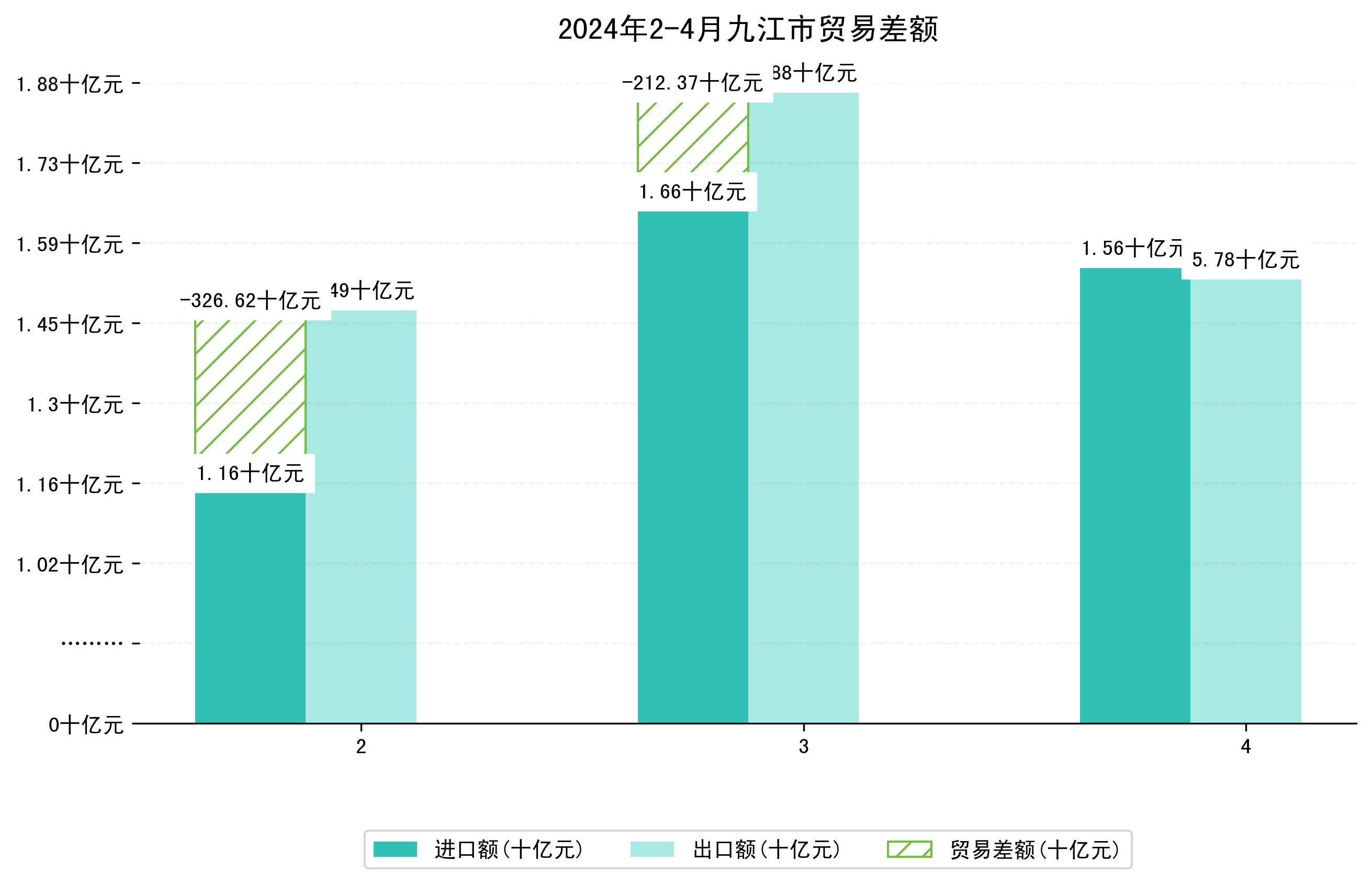 以人民币计,2024年1-4月九江市贸易差额为10,6199,0923万元(贸易顺差),相比上年同期减少了327,1410,8968万元,同比减少-96.86%。