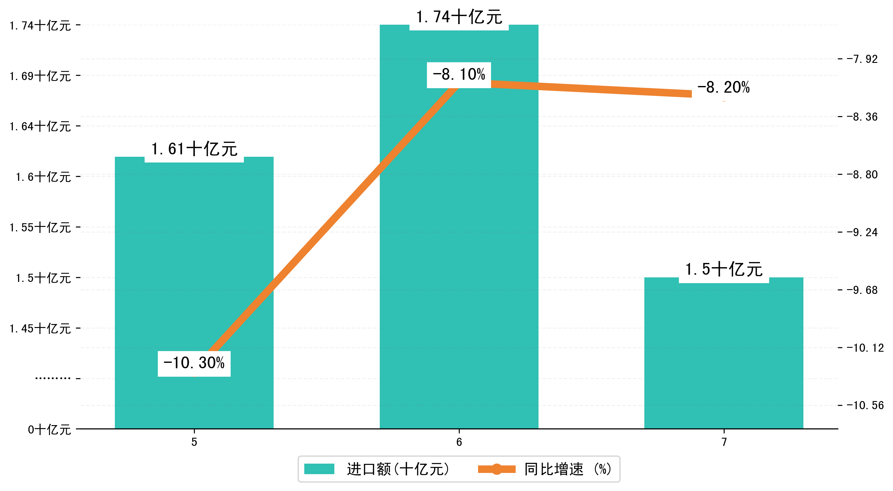 以人民币计,2024年1-7月九江市进口额为108,4520.8258万元,相比上年同期减少了9,0585.8247万元,同比减少了-8.20%。
