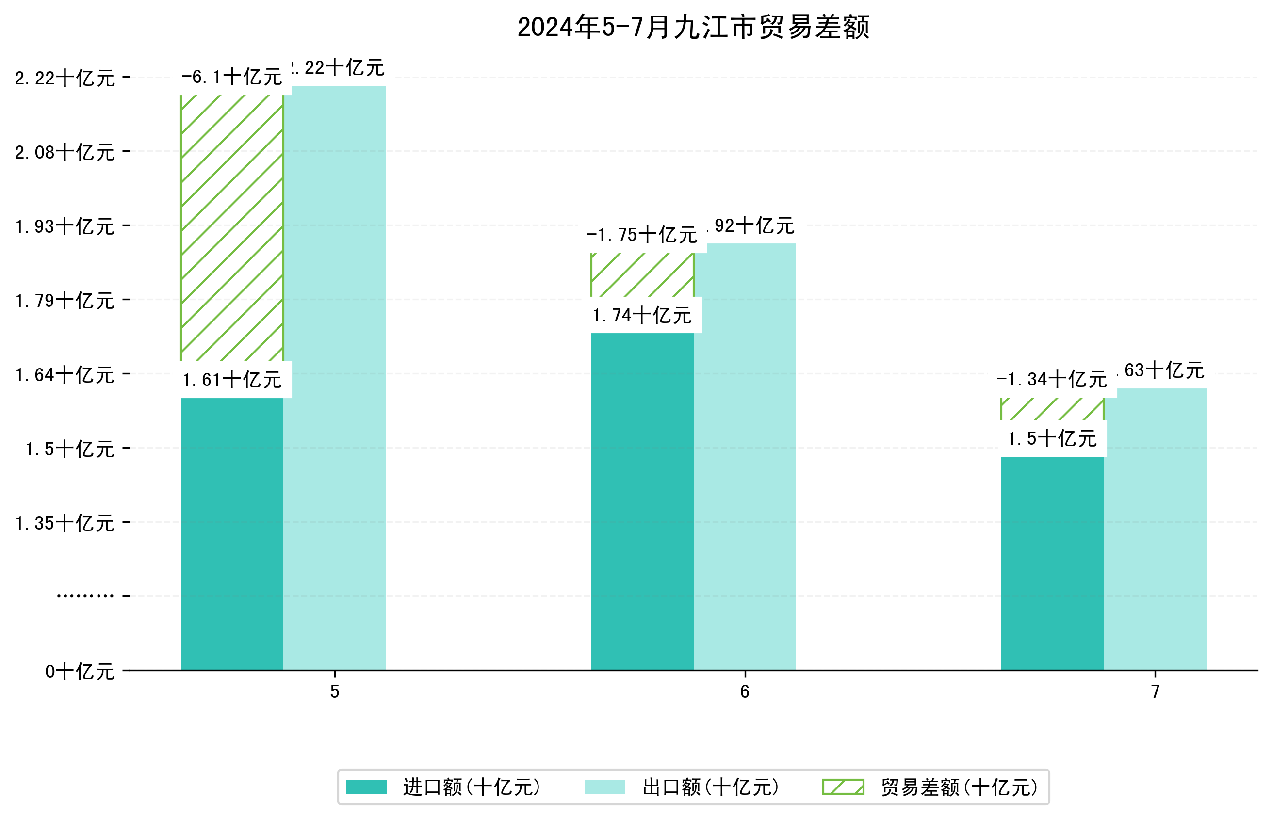 以人民币计,2024年1-7月九江市贸易差额为19,6478,5922万元(贸易顺差),相比上年同期减少了280,8500,2711万元,同比减少-93.46%。