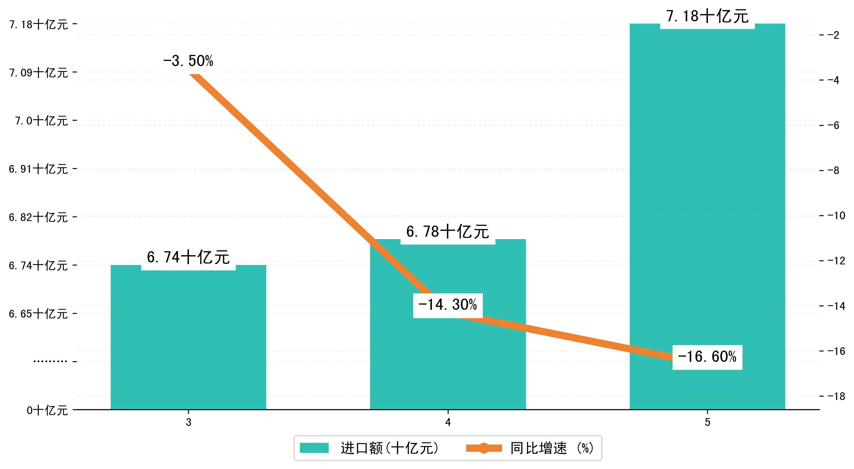 以人民币计,2023年5月昆明市进口额为71,7659.0579万元,相比上月增加了3,9254.3986万元;相比上年同期减少了26,1674.9068万元,同比减少了-16.60%。