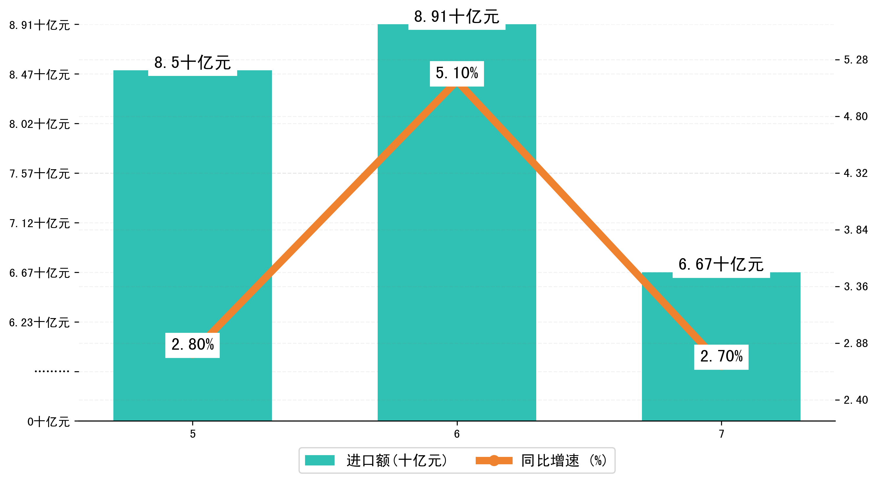 以人民币计,2024年7月昆明市进口额为66,7414.5028万元,相比上月减少了22,4073.7773万元;相比上年同期减少了9,0165.1237万元,同比增加了2.70%。