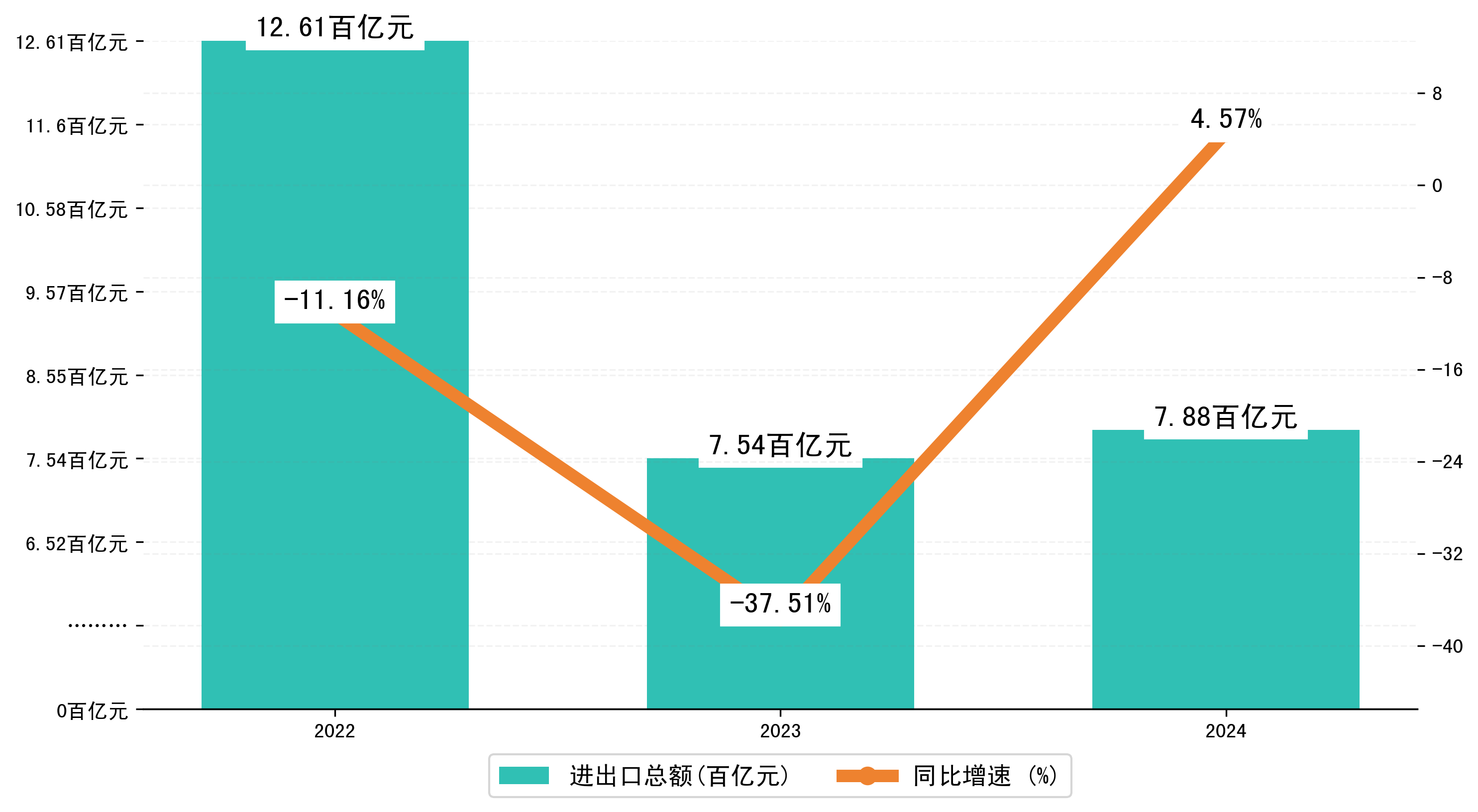 以人民币计,2024年1-7月昆明市进出口总额为787,9945.9708万元,相比上年同期增加了34,4682.848万元,同比增加了7.30%。