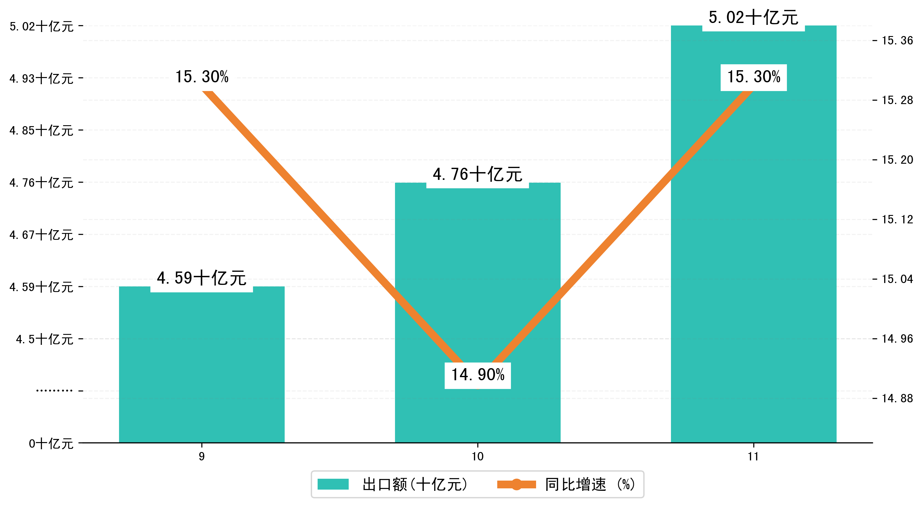 以美元计,2024年11月昆明市出口额为7,0499.6179万美元,相比上月增加了3334.3771万美元;相比上年同期增加了1,2195.1415万美元,同比增加14.20%。