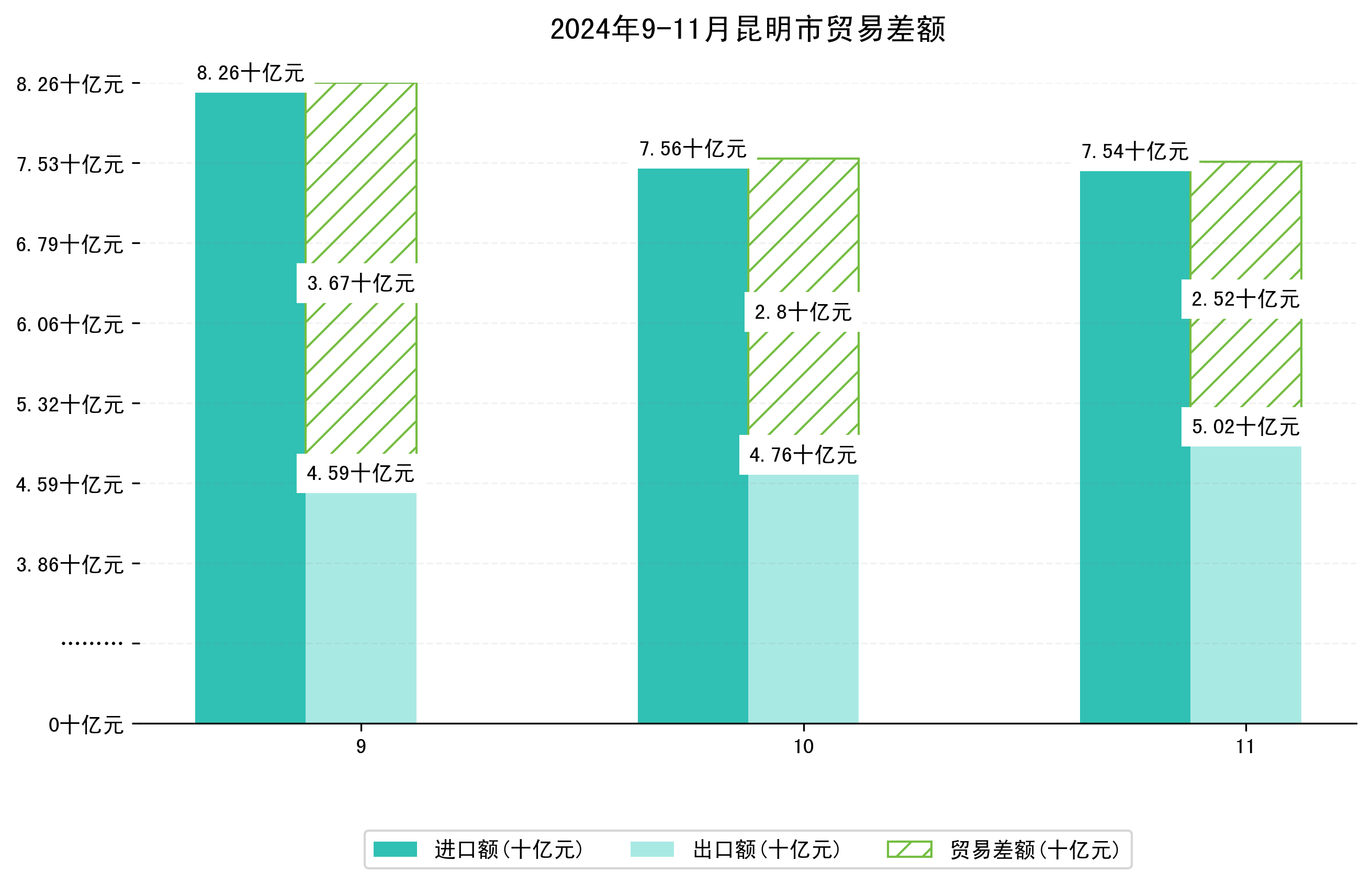 以人民币计,2024年11月昆明市贸易差额为25,2292,2251万元(贸易逆差),相比上月增加了2,8204,9786万元,即4171,0744万美元;相比上年同期增加了18,0189,4077万元,同比增加-41.66%。