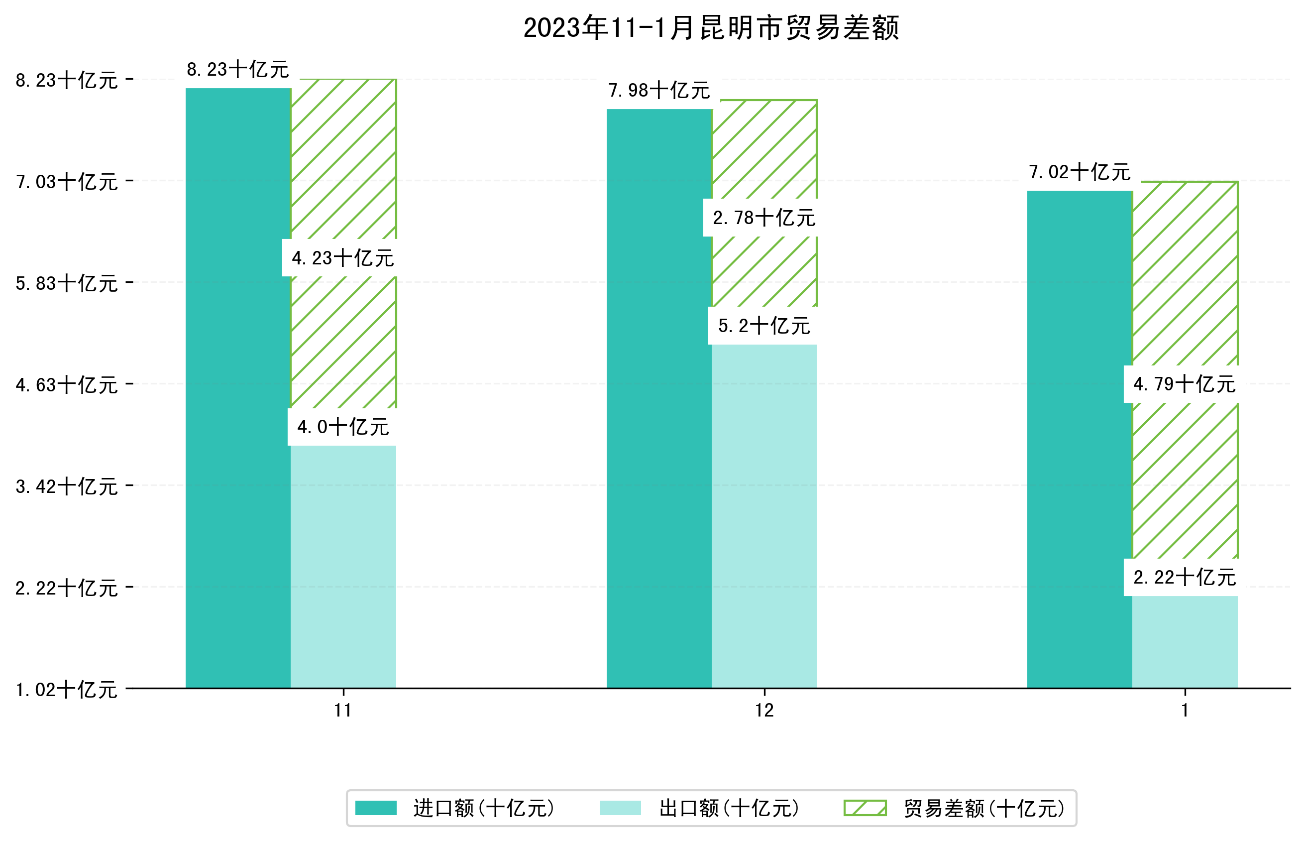 以人民币计,2023年1-1月昆明市贸易差额为47,9422,6854万元(贸易逆差),相比上年同期减少了46,5834,7641万元,同比减少3428.3%。