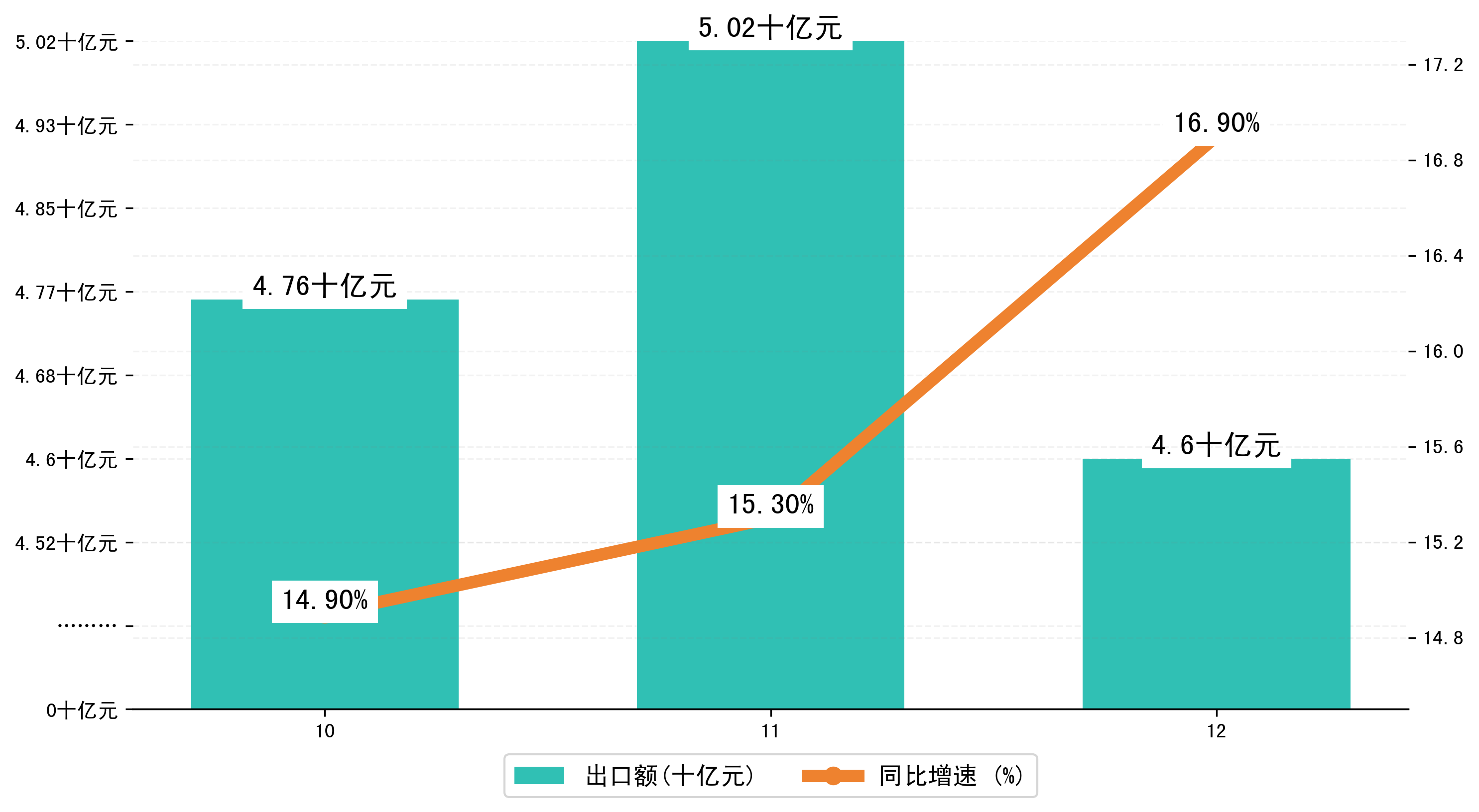 以人民币计,2024年12月昆明市出口额为46,0080.293万元,相比上月减少了4,1551.3066万元;相比上年同期增加了12,0551.3076万元,同比增加了16.90%。