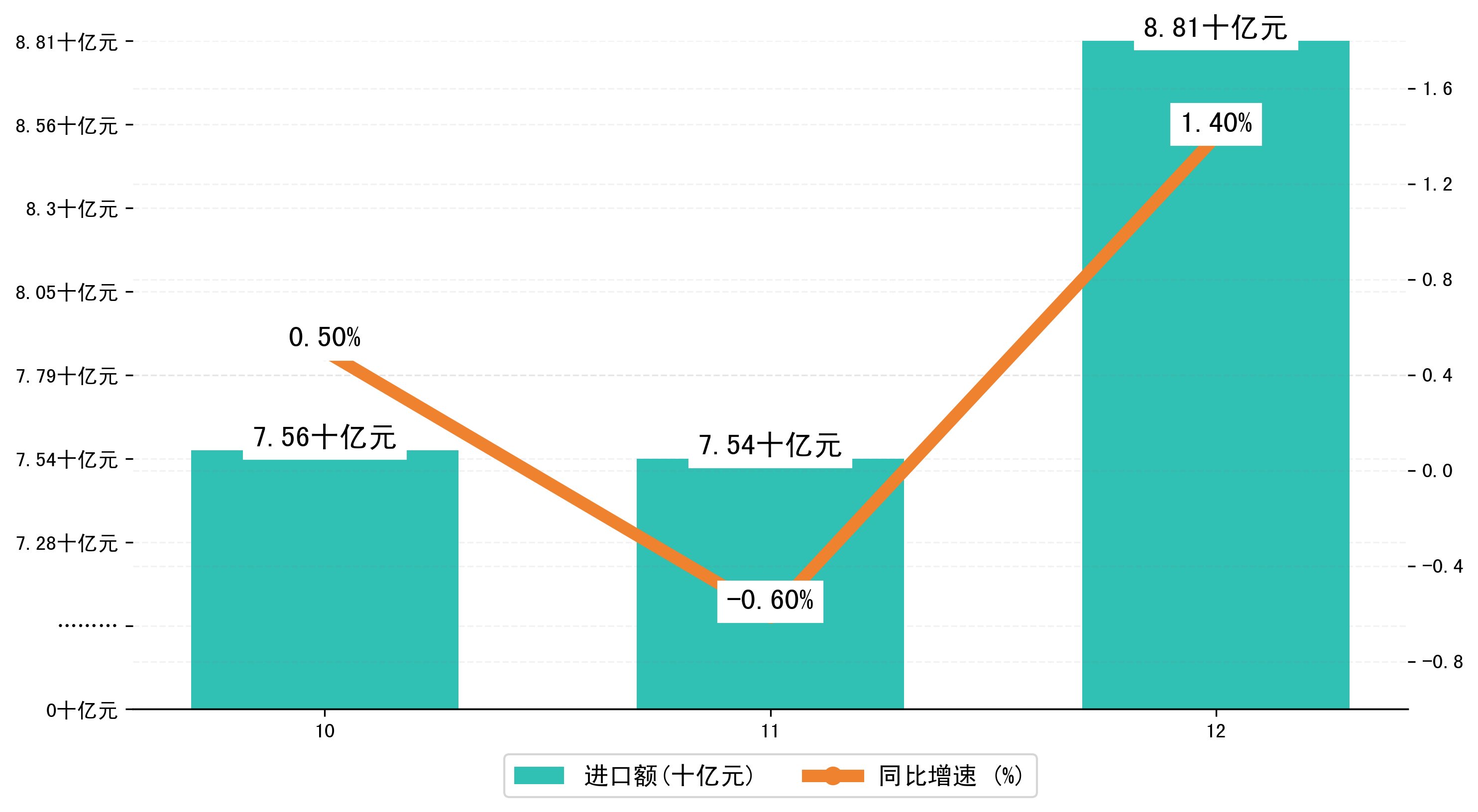 以人民币计,2024年12月昆明市进口额为88,1412.8958万元,相比上月增加了12,7489.0711万元;相比上年同期增加了16,9982.9597万元,同比增加了1.40%。