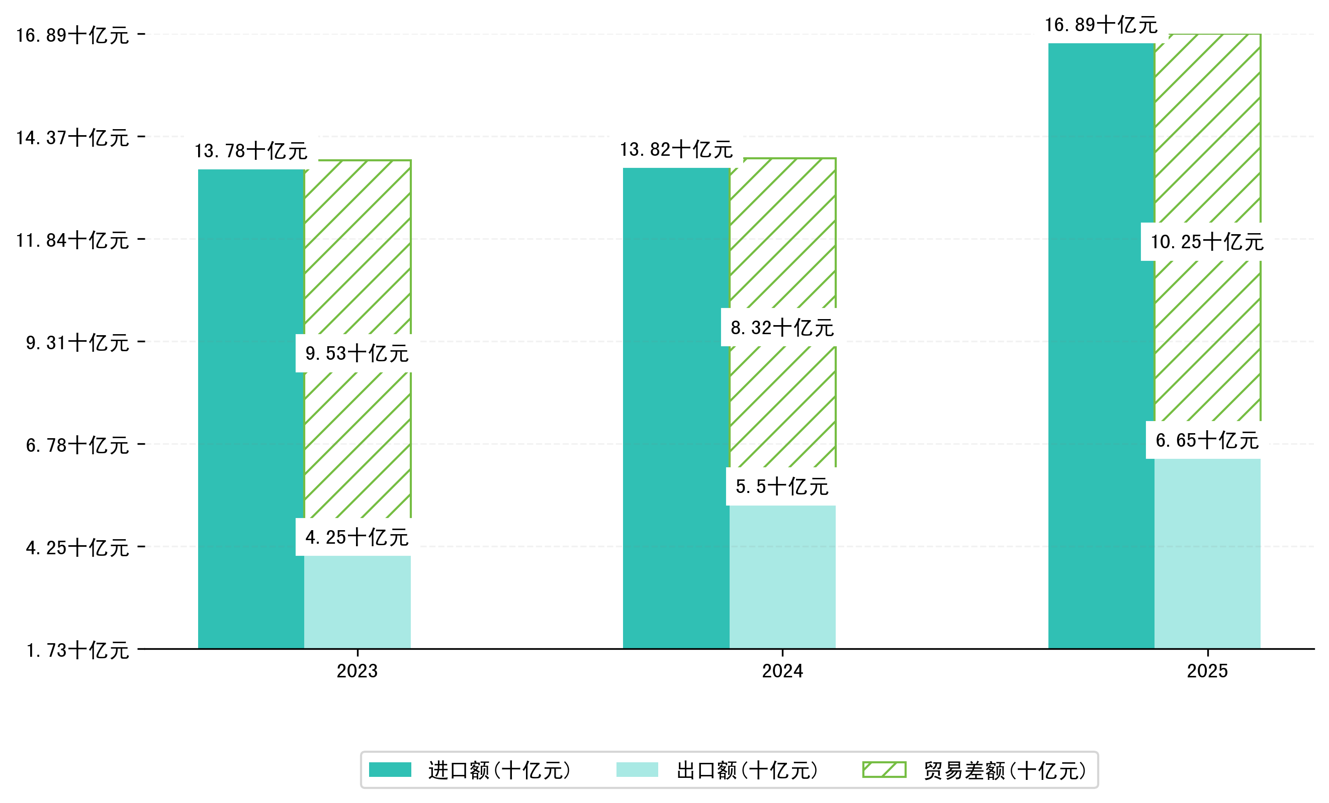 以人民币计,2025年2月昆明市贸易差额为50,9739,7118万元(贸易逆差),相比上月增加了5109,6553万元,即715,8381万美元;相比上年同期减少了13,8888,4023万元,同比减少37.45%。