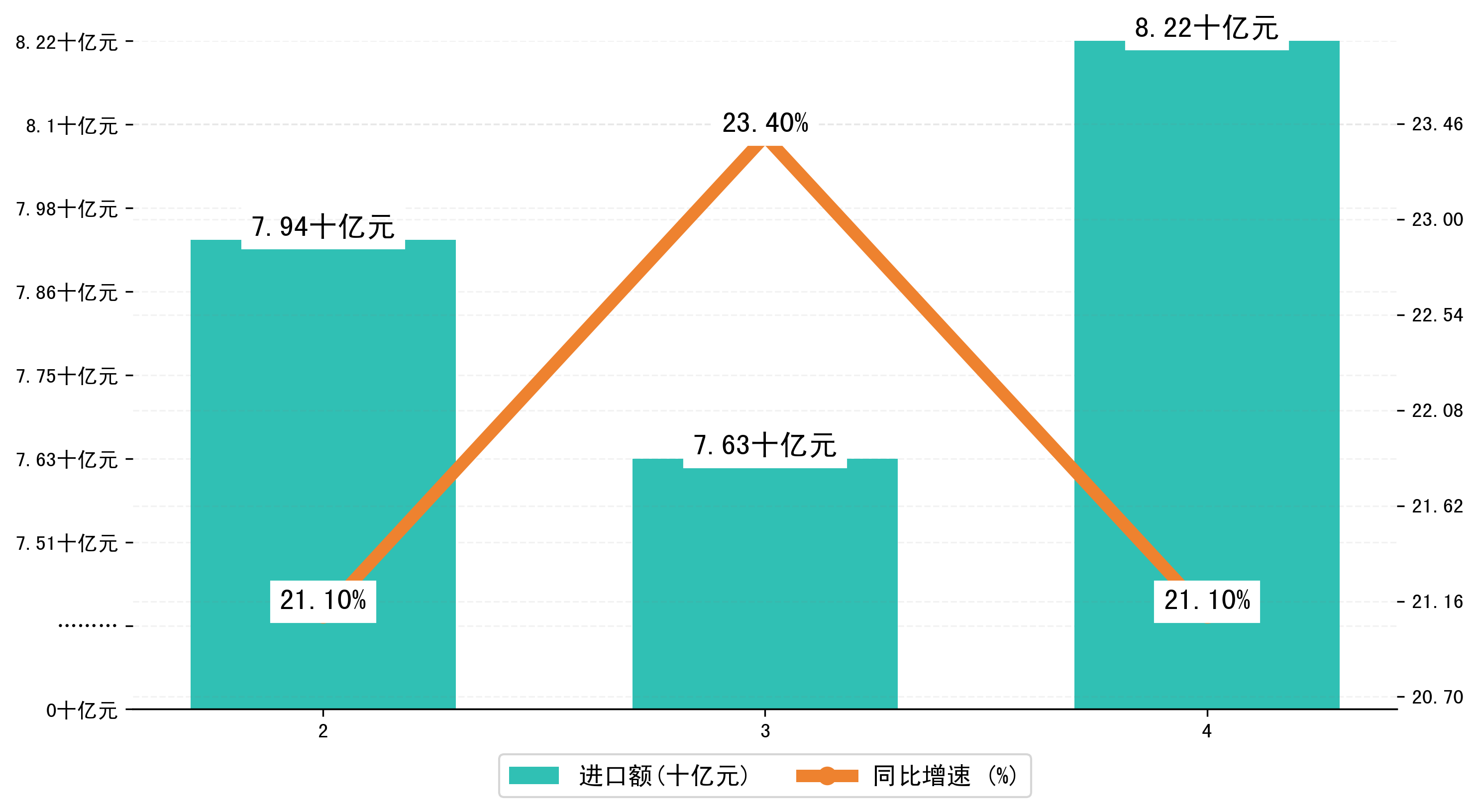 以人民币计,2025年4月昆明市进口额为82,1537.8297万元,相比上月增加了5,8766.9454万元;相比上年同期增加了10,6968.9677万元,同比增加了21.10%。