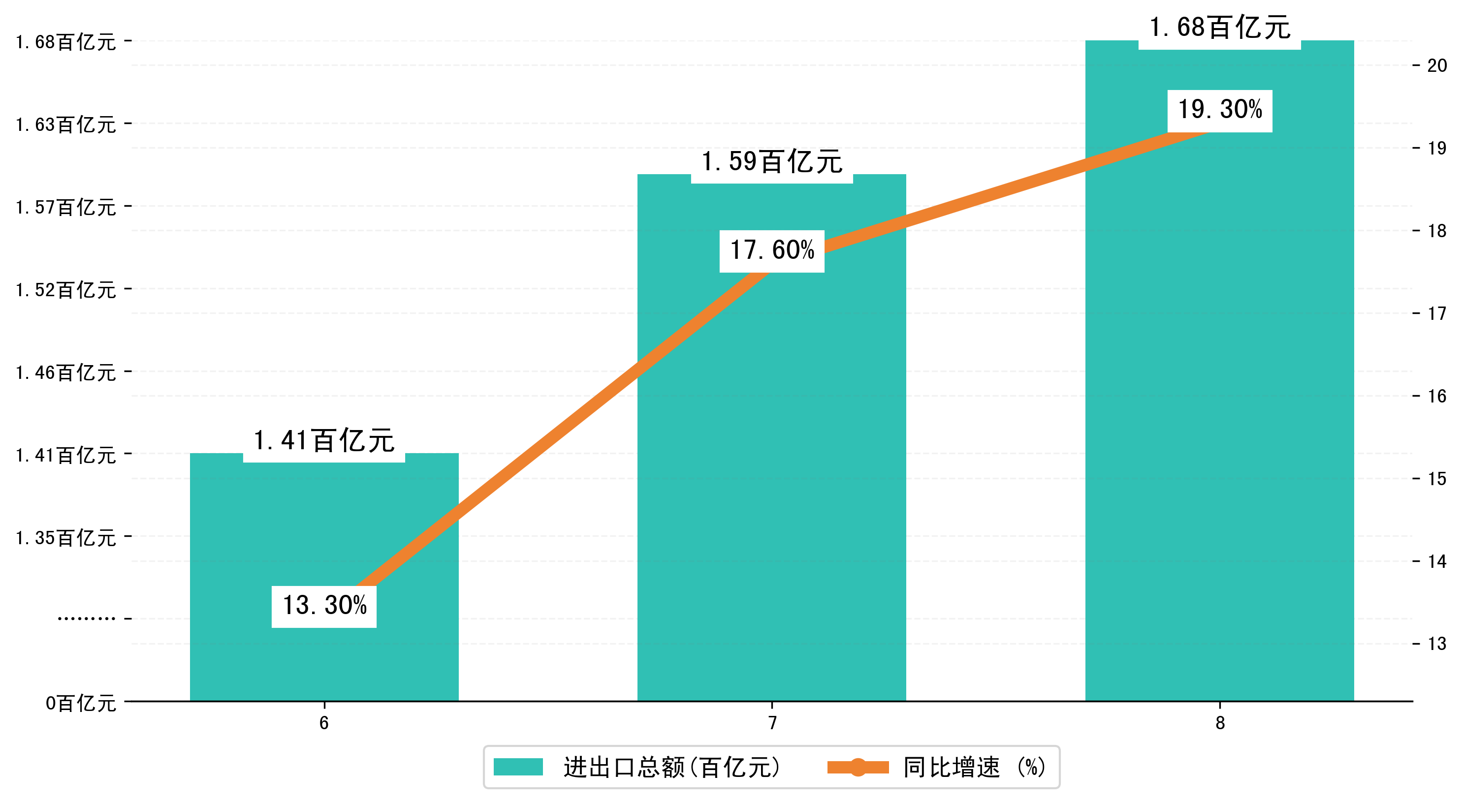 以人民币计,2025年8月昆明市进出口总额为168,0904.6905万元,相比上月增加了8,9188.4955万元;相比上年同期增加了37,8113.0144万元,同比增加了19.30%。
