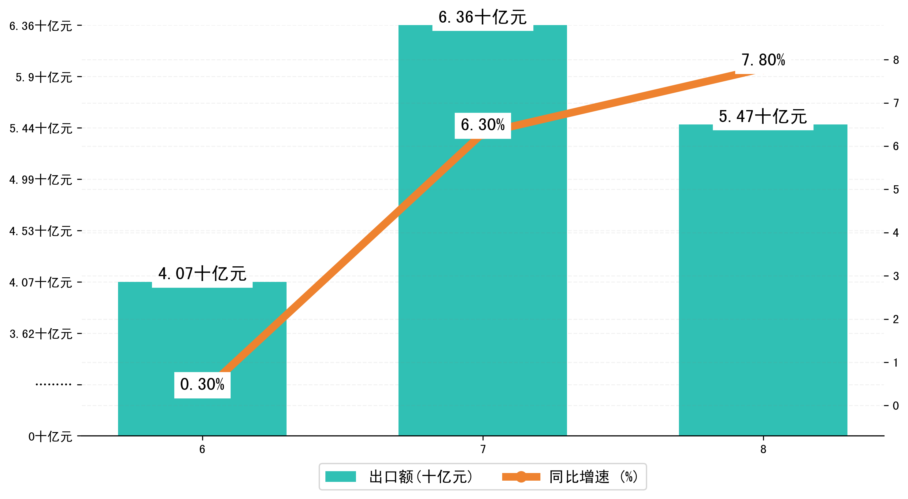 以人民币计,2025年8月昆明市出口额为54,7193.197万元,相比上月减少了8,8355.8073万元;相比上年同期增加了7,7952.4082万元,同比增加了7.80%。