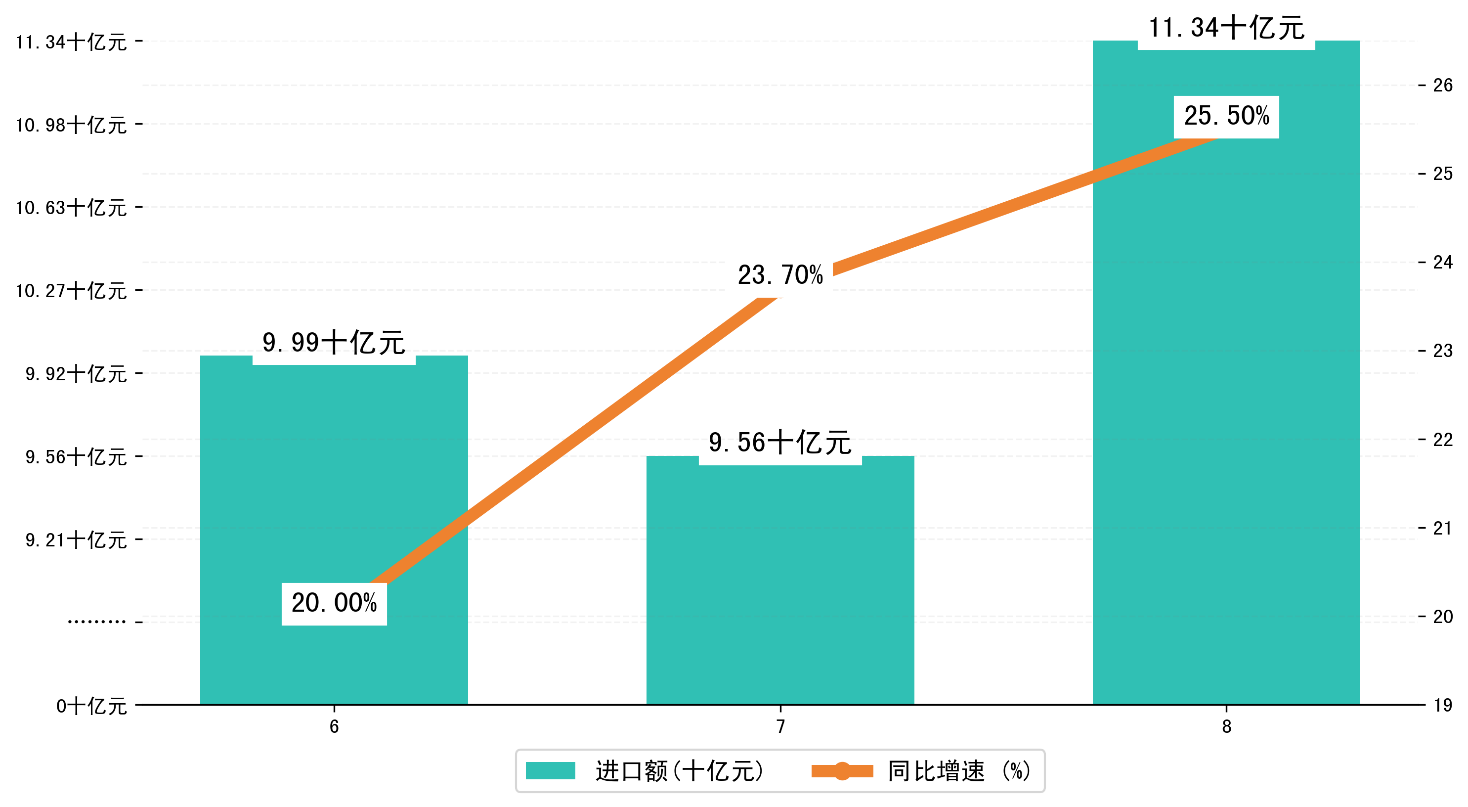 以人民币计,2025年8月昆明市进口额为113,3711.4935万元,相比上月增加了17,7544.3027万元;相比上年同期增加了30,0160.6063万元,同比增加了25.50%。