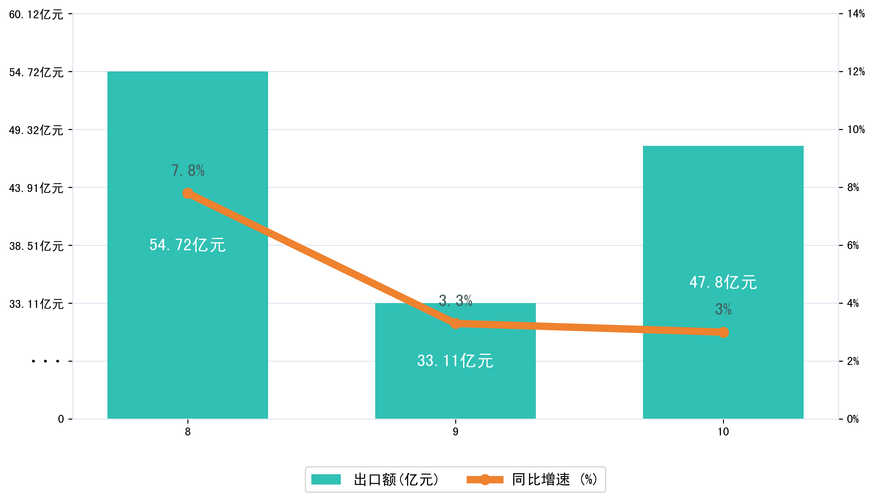 以美元计,2025年1-10月昆明市出口额为60,0014.0329万美元,相比上年同期增加了1,2544.9378万美元,同比增加2.10%。
