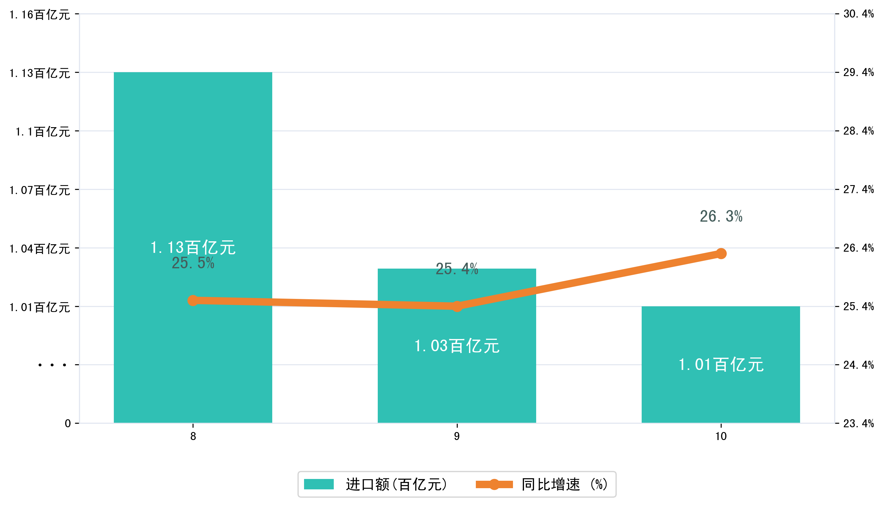 以人民币计,2025年10月昆明市进口额为100,8930.5451万元,相比上月减少了2,0097.0839万元;相比上年同期增加了25,2517.5155万元,同比增加了26.30%。