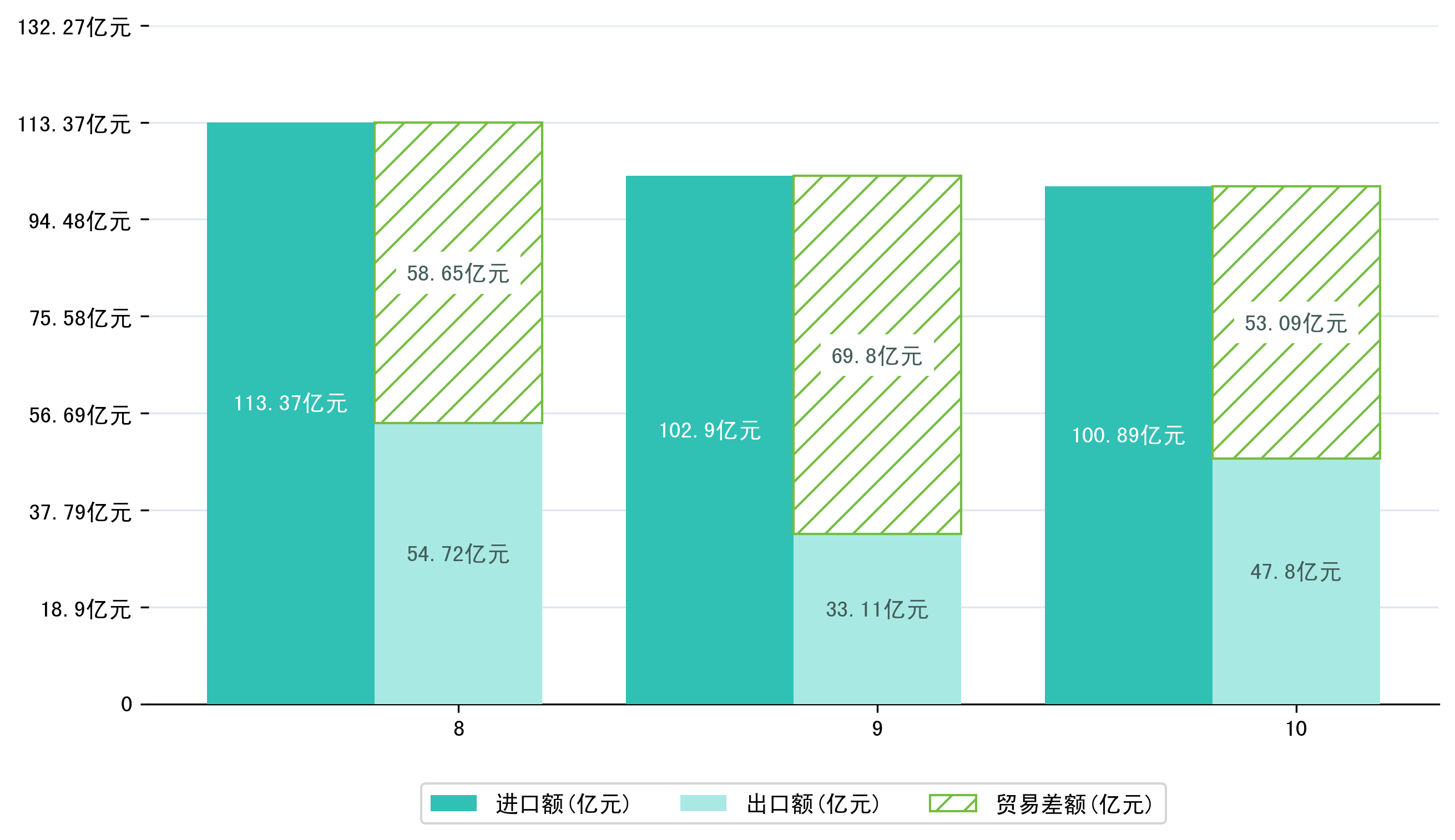 以美元计,2025年10月昆明市贸易差额为7,4627,5278万美元(贸易逆差),相比上月增加了2,3094,0344万美元;相比上年同期减少了3,5024,9905万美元,同比减少88.44%。