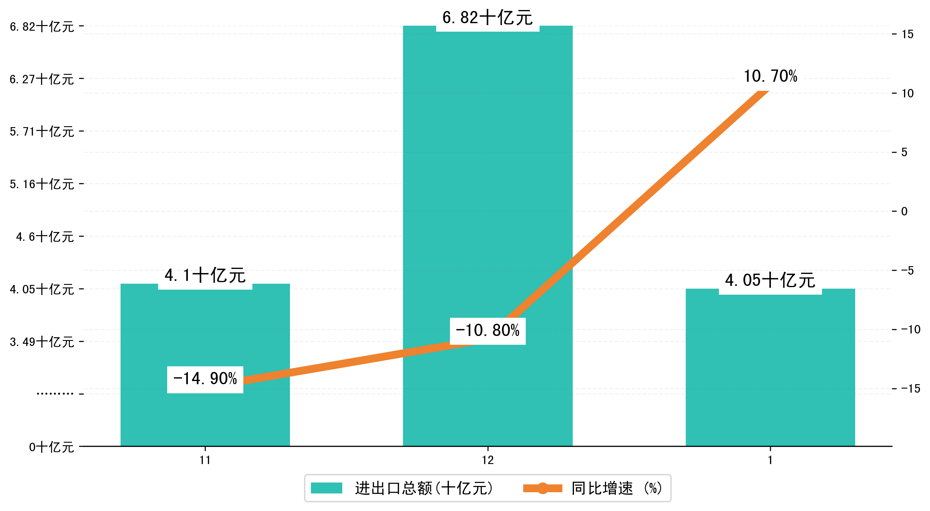 以美元计,2024年1-1月廊坊市进出口总额为5,7013.6218万美元,相比上年同期增加了4482.4725万美元,同比增加8.70%。