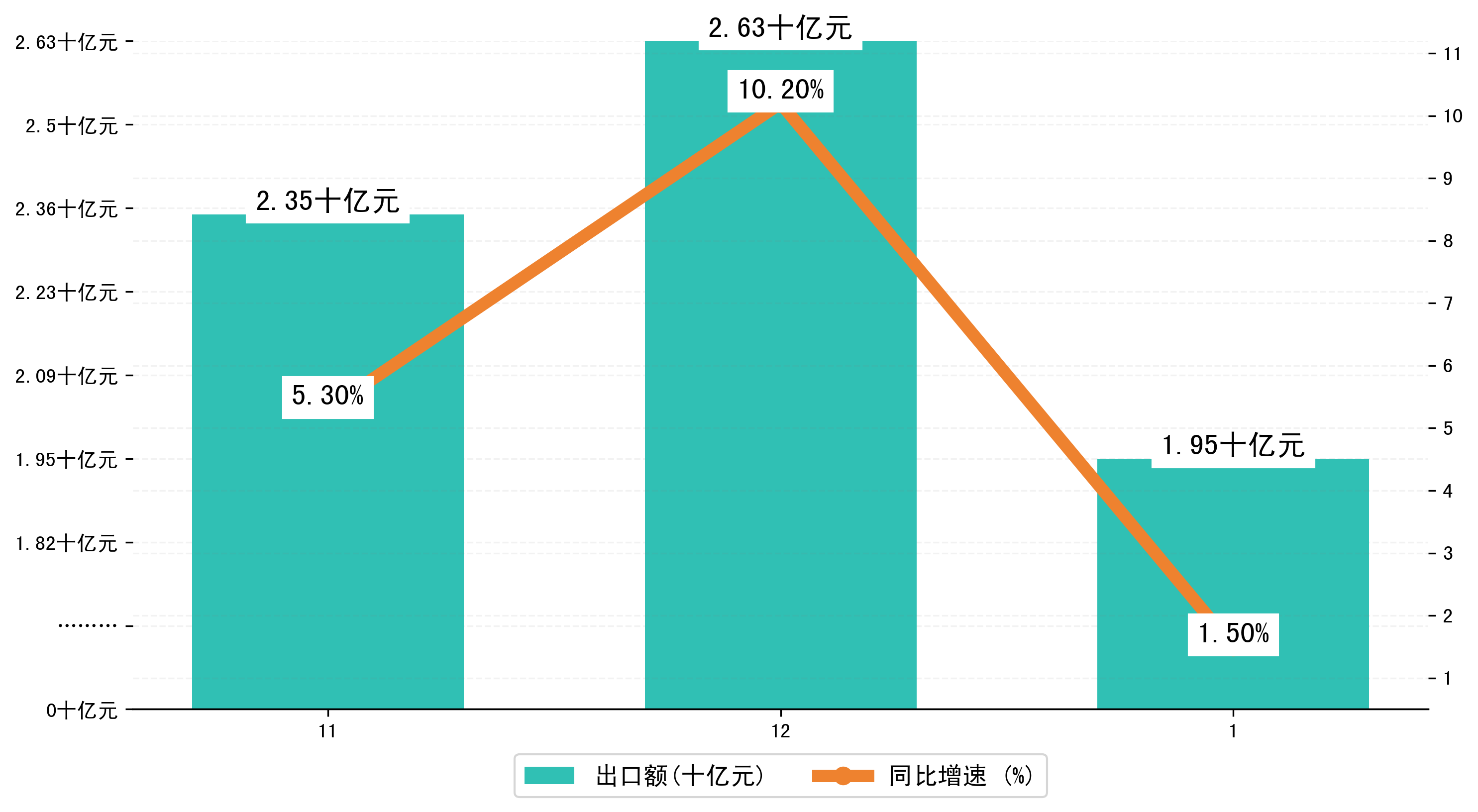 以美元计,2024年1-1月廊坊市出口额为2,7554.3995万美元,相比上年同期增加了187.4666万美元,同比增加-0.20%。