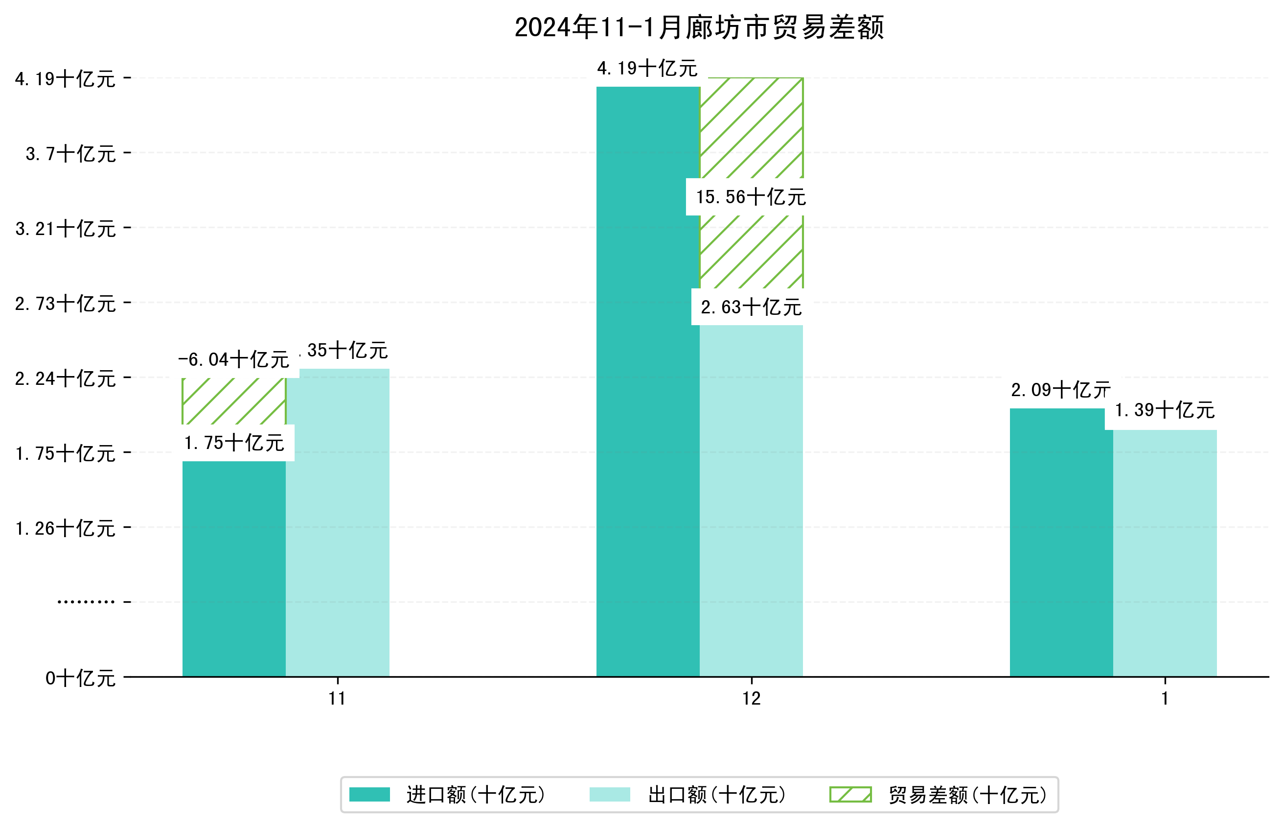 以人民币计,2024年1-1月廊坊市贸易差额为1,3902,9926万元(贸易逆差),相比上年同期减少了3,4253,2882万元,同比减少-168.32%。