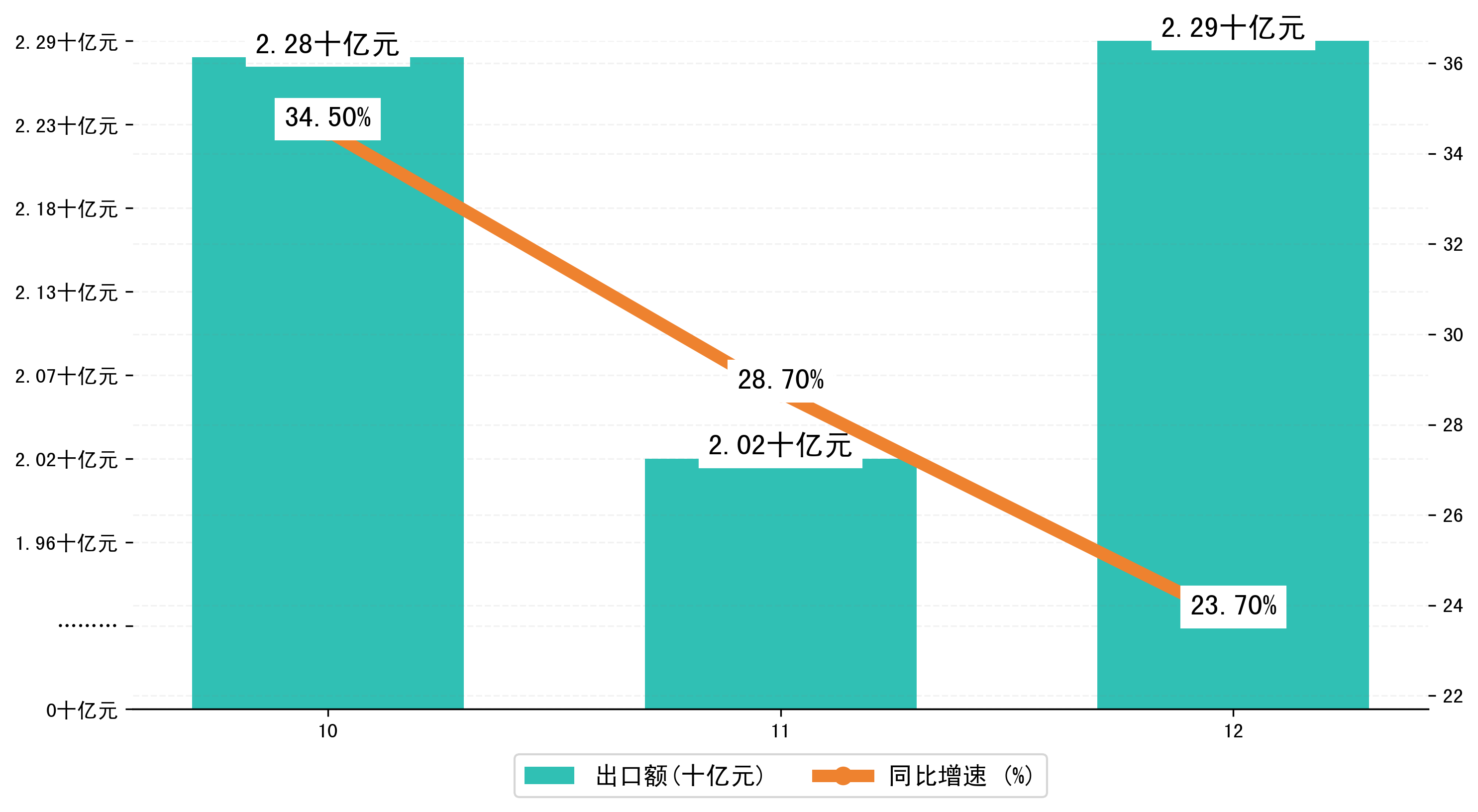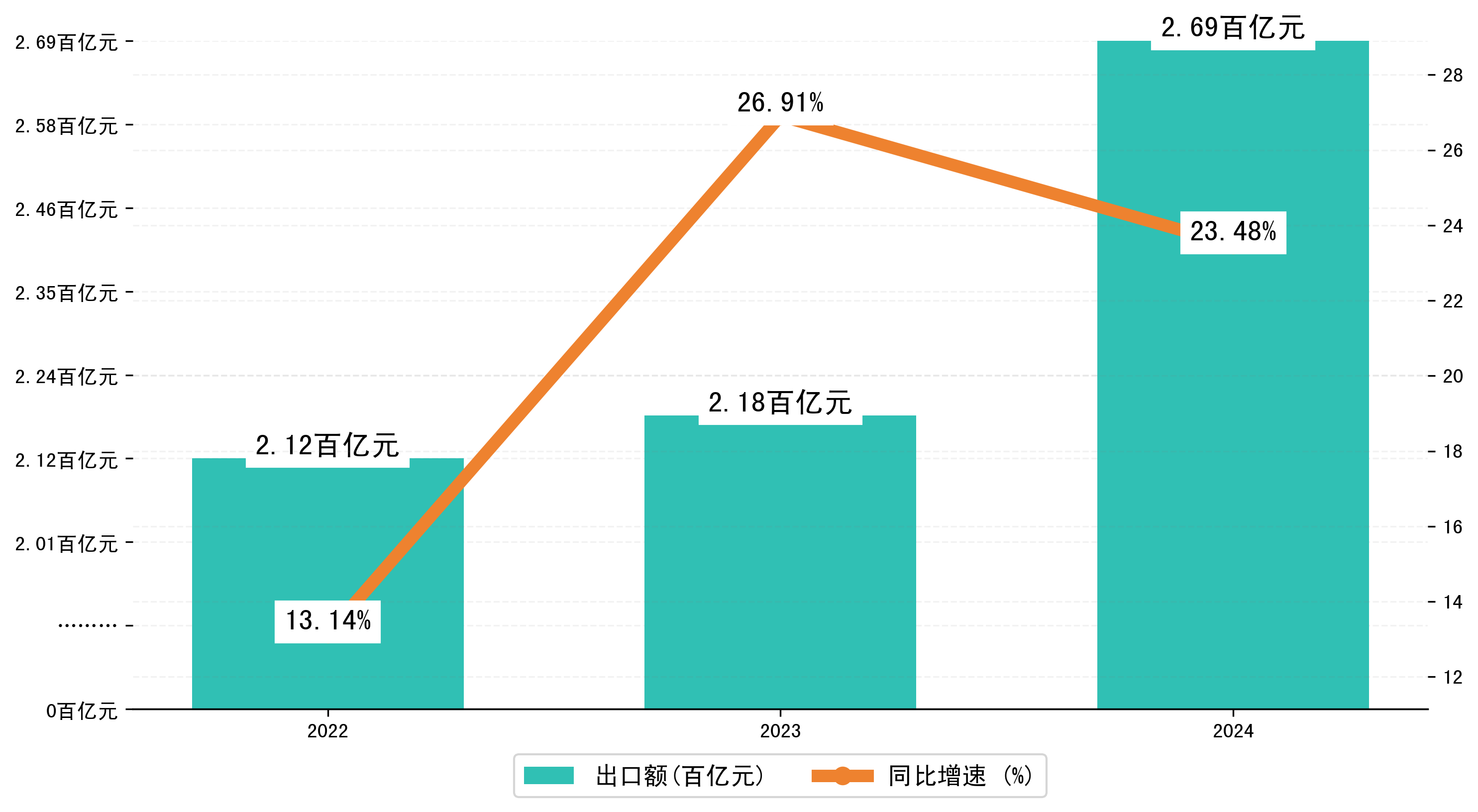 以人民币计,2024年1-12月廊坊市出口额为269,3220.2832万元,相比上年同期增加了51,2123.8698万元,同比增加了23.70%。