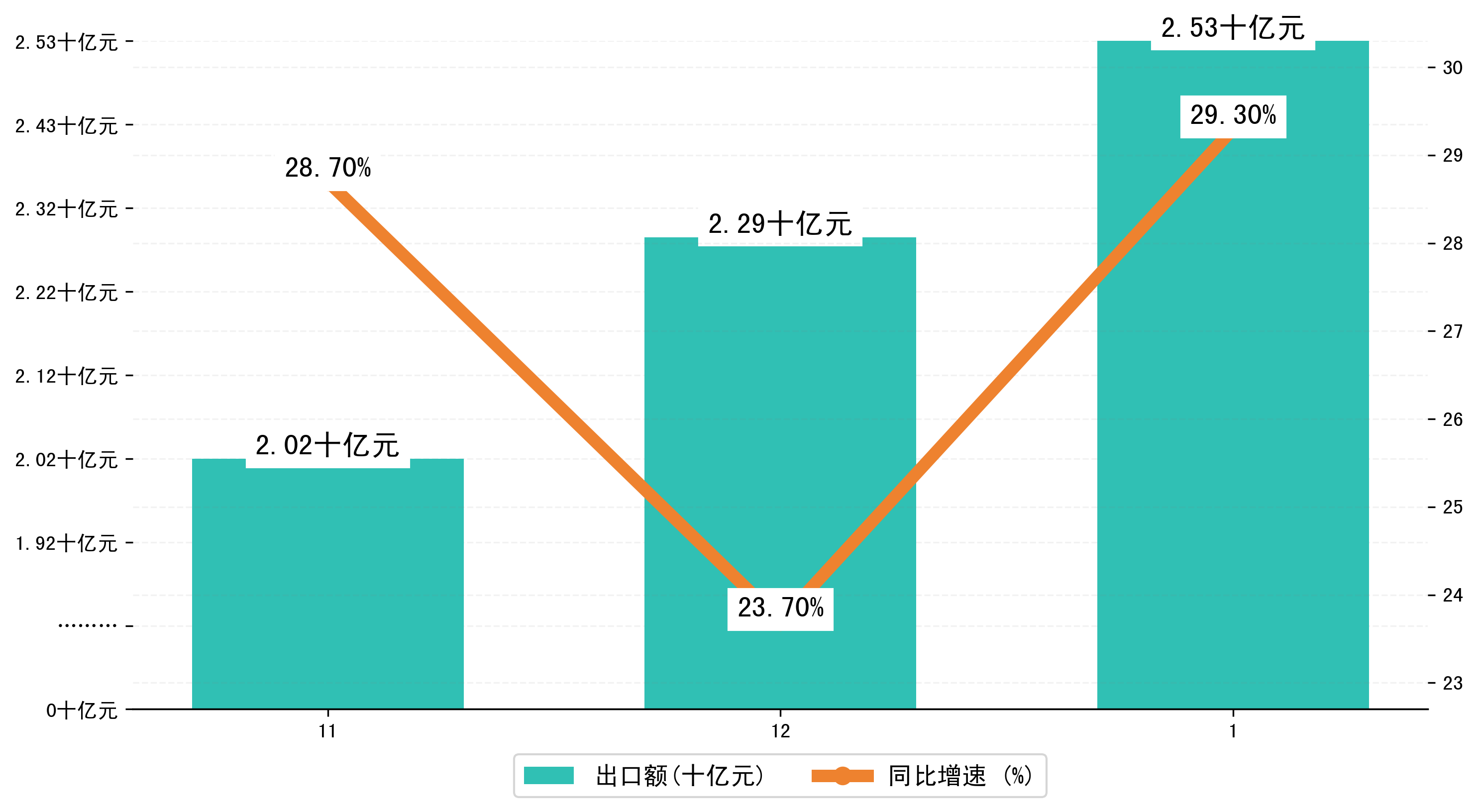 以美元计,2025年1-1月廊坊市出口额为3,5138.0004万美元,相比上年同期增加了7583.6009万美元,同比增加27.50%。