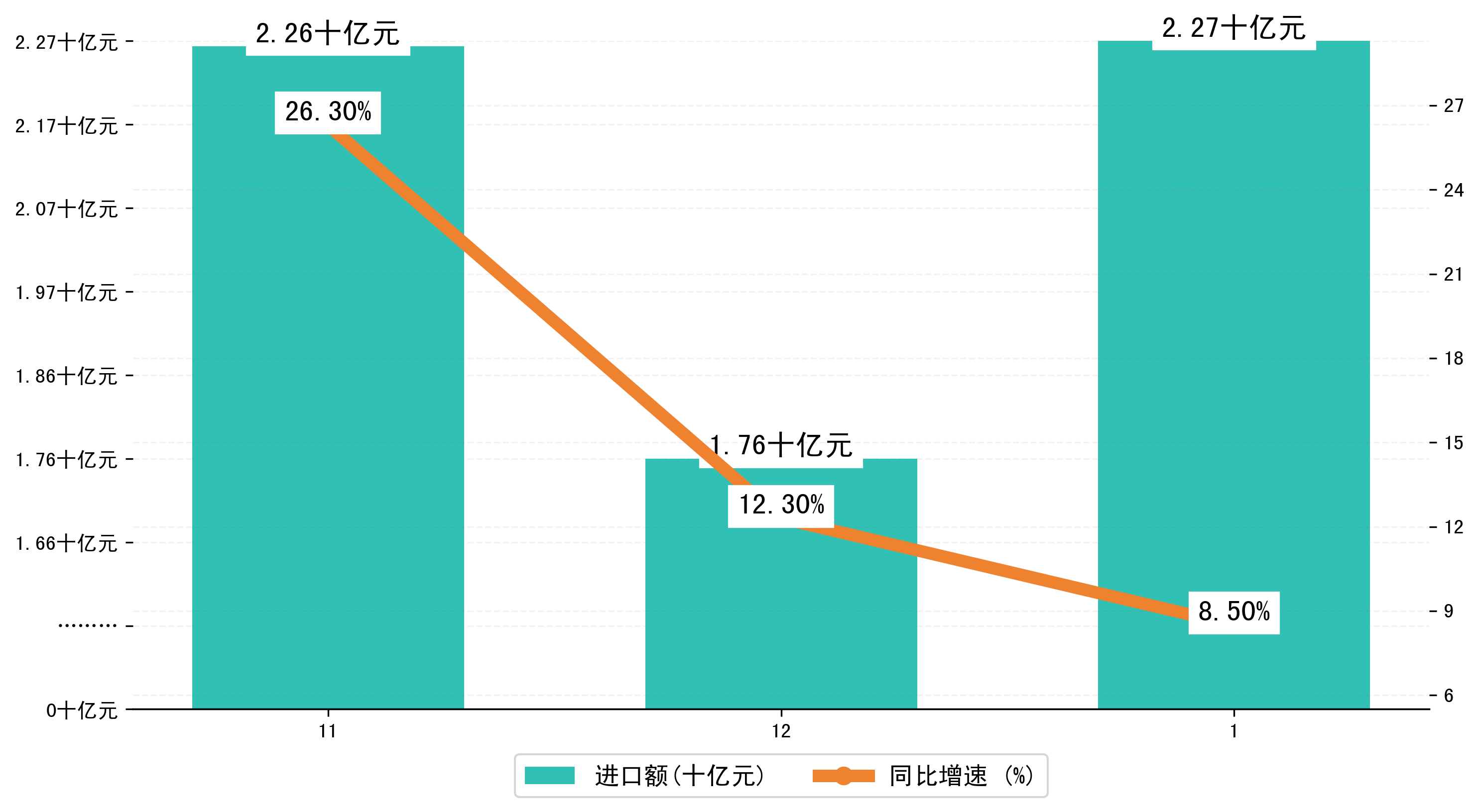 以人民币计,2025年1月廊坊市进口额为22,7146.8597万元,相比上月增加了5,0964.7322万元;相比上年同期增加了1,7801.001万元,同比增加了8.50%。