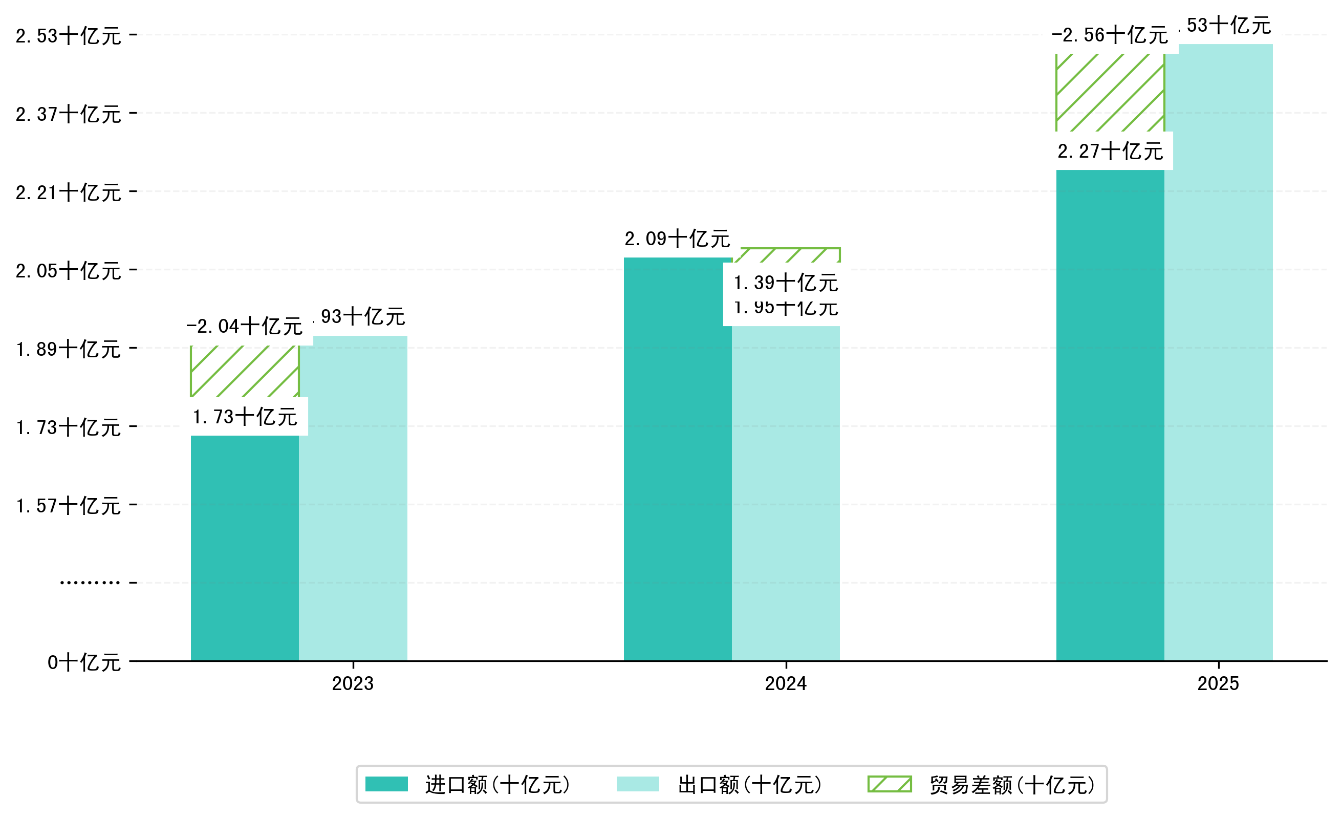 以人民币计,2025年1月廊坊市贸易差额为2,5633,4404万元(贸易顺差),相比上月减少了2,7040,0604万元,即3704,9860万美元;相比上年同期增加了3,9536,4330万元,同比增加-284.37%。