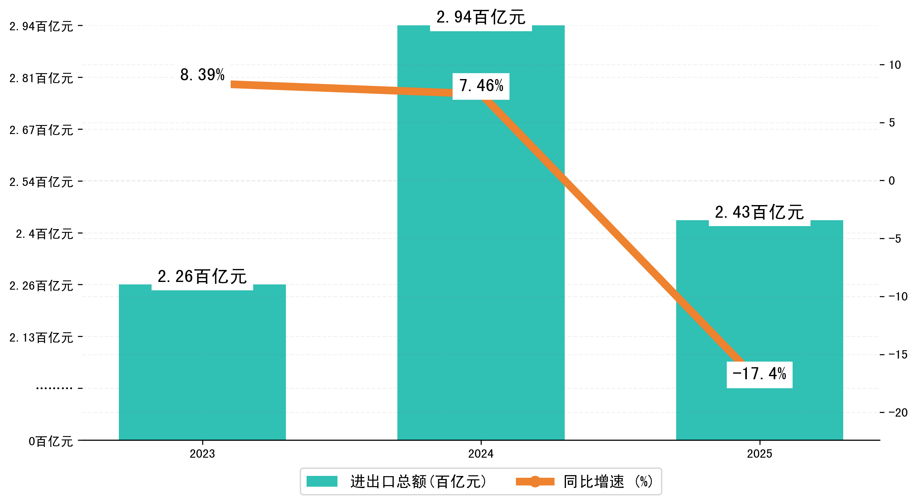 以人民币计,2025年1-6月廊坊市进出口总额为243,2489.6384万元,相比上年同期减少了51,2454.2196万元,同比减少了-17.40%。