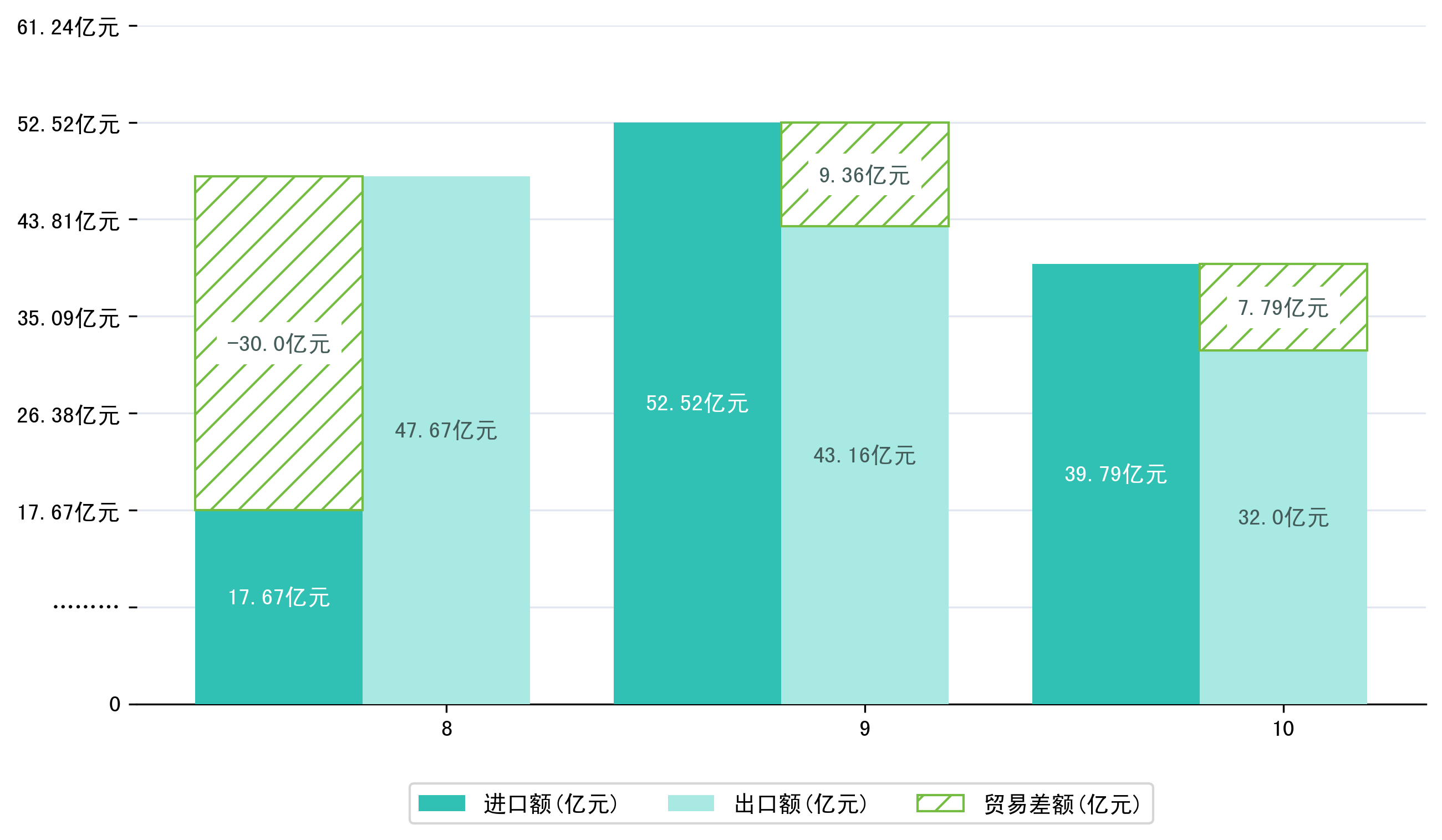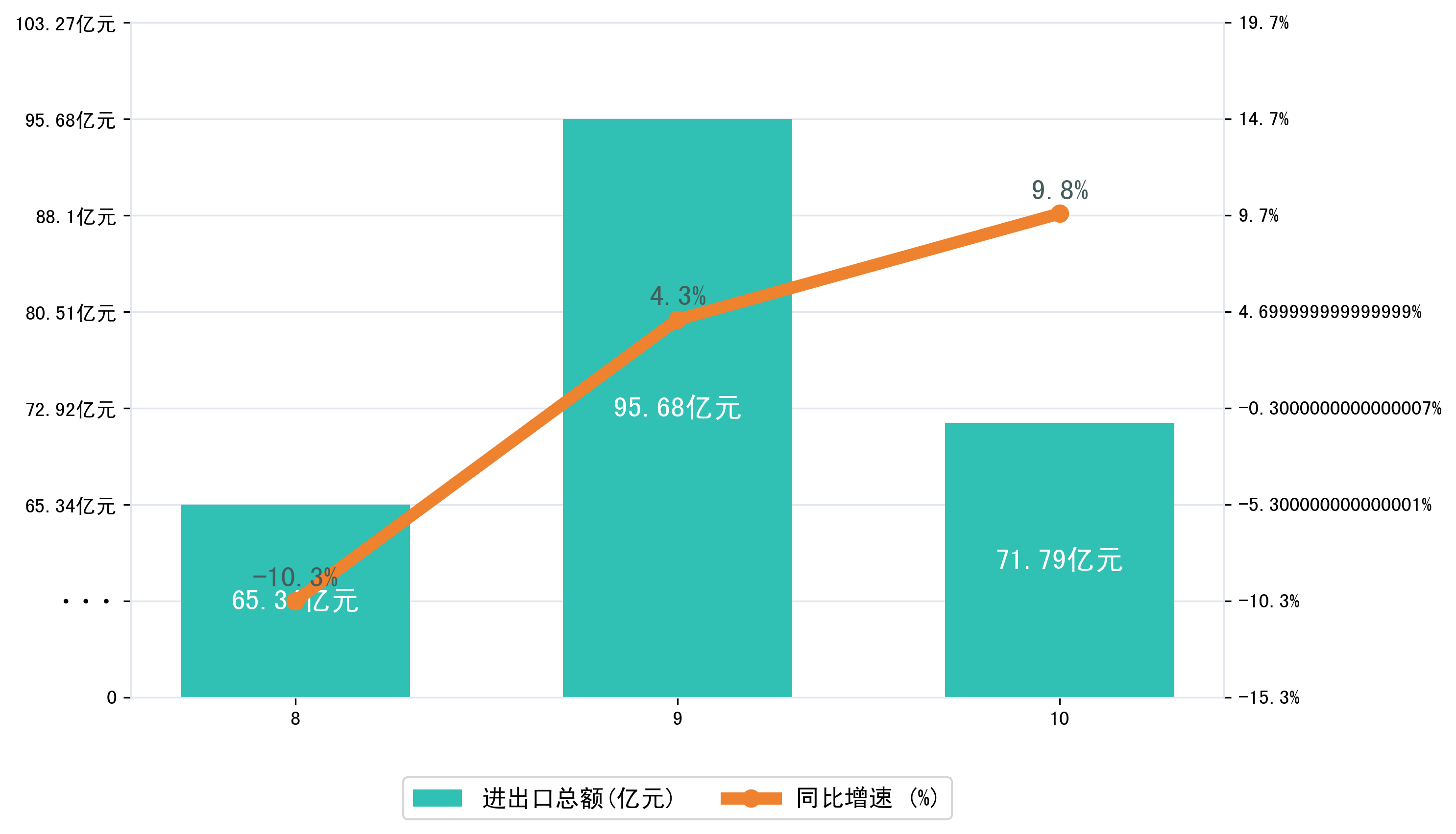 以人民币计,2025年1-10月廊坊市进出口总额为514,6109.8178万元,相比上年同期增加了46,1684.4817万元,同比增加了9.80%。